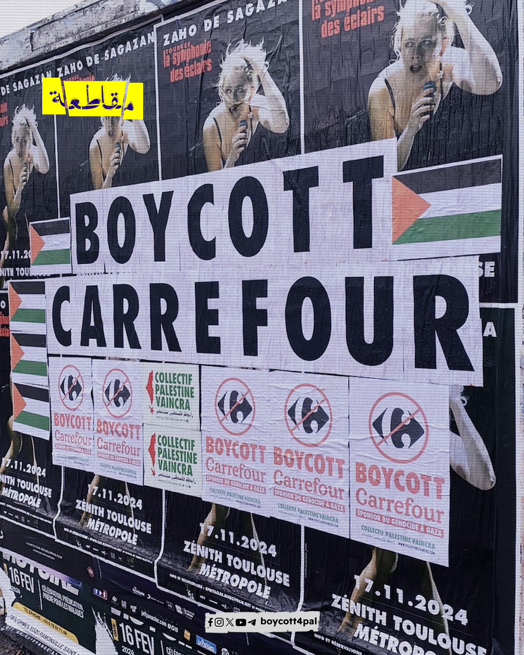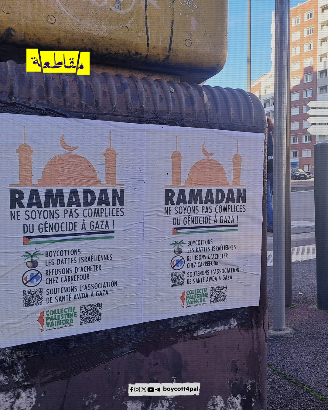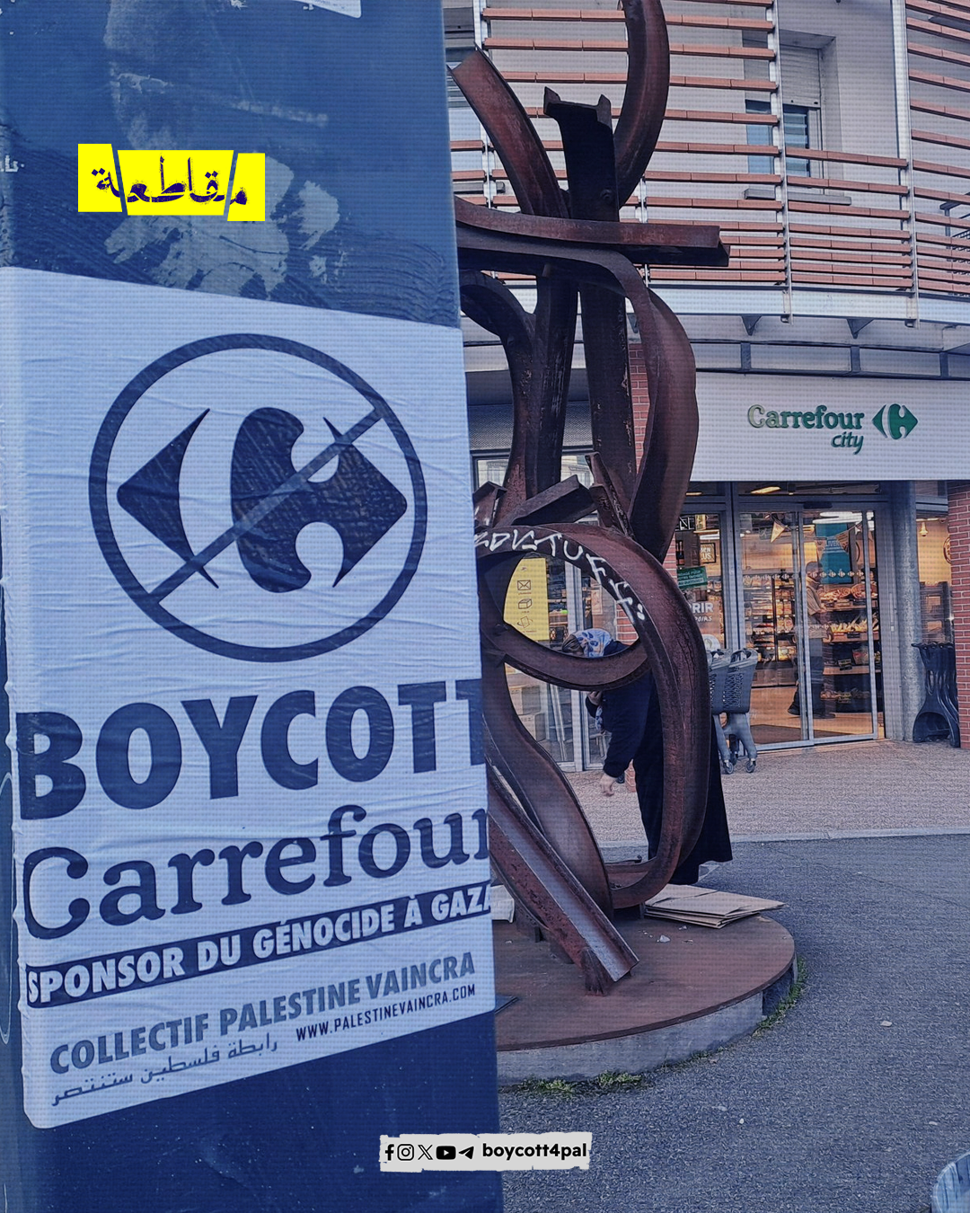 تتواصل في المدينة الفرنسية حملة من التصعيد ضد متجر الإبادة متعدد الجنسيات عبر نشر ملصقات توعية تفضح تواطؤ شركة كارفور في الإبادة الجماعية التي يجريها الاحتلال الإسرائيلي في غزة من خلال تقديم الطرود الغذائية للجنود الصهاينة، وفتح متاجر في الأراضي المحتلة، خاصةً في مستوطنات الضفة الغربية.