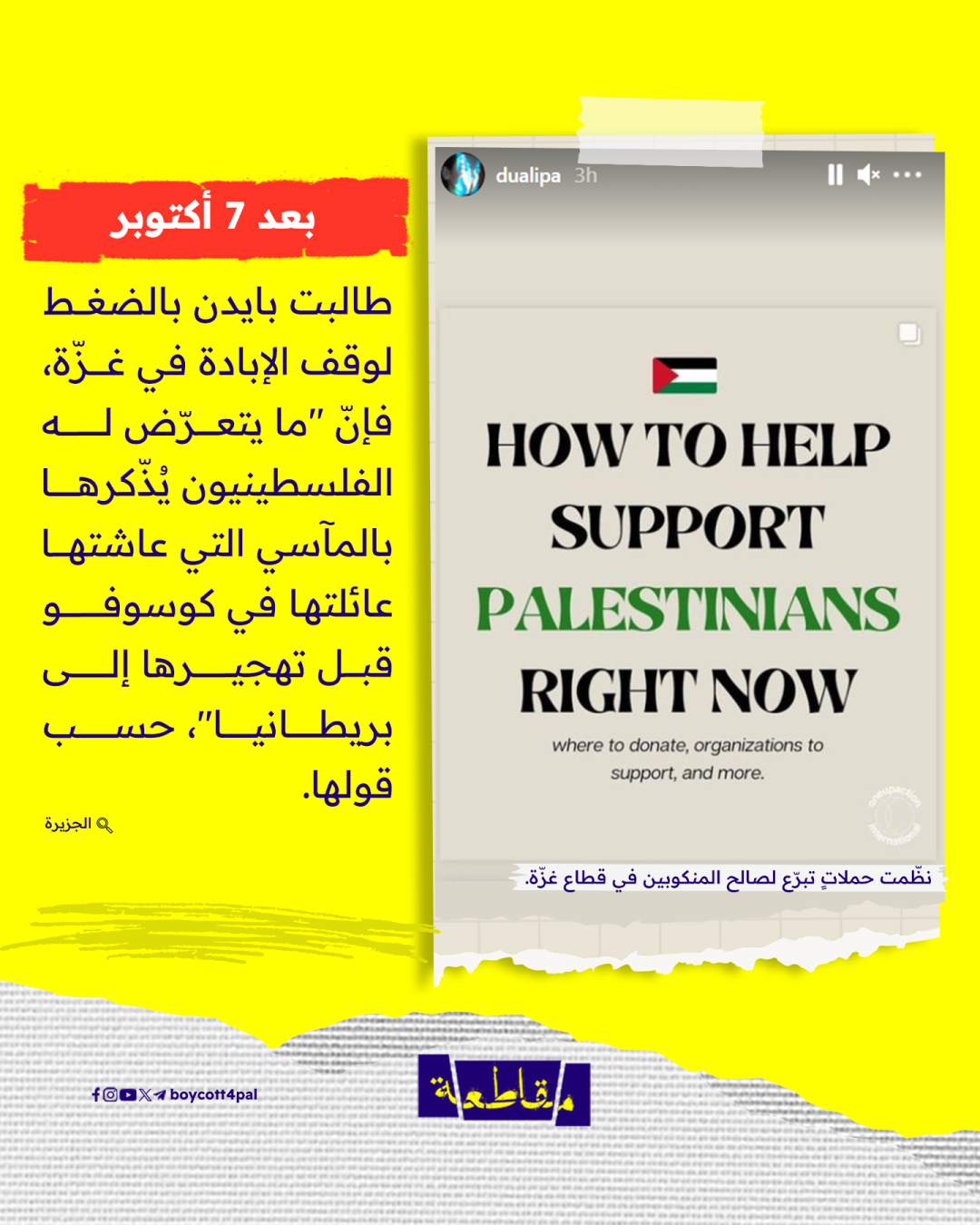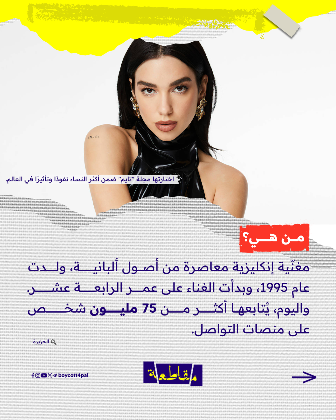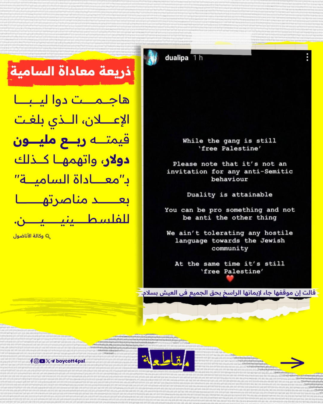 🟡 إلى جانب فنّها، إن أكثر ما جعل دوا ليبا قريبة من شعوب منطقتنا كان احتوائها لقضاياها ودعمها لحقوق أهلها، علمًا أنها تعرّضت لانتقادات واسعة لتعاقدها مع شركة “بوما” للألبسة والمستلزمات الرياضية، ما اعتبره البعض تورّطًا غير مباشر مع الاحتلال، وسط حملة شرسة لمقاطعة الشركة.