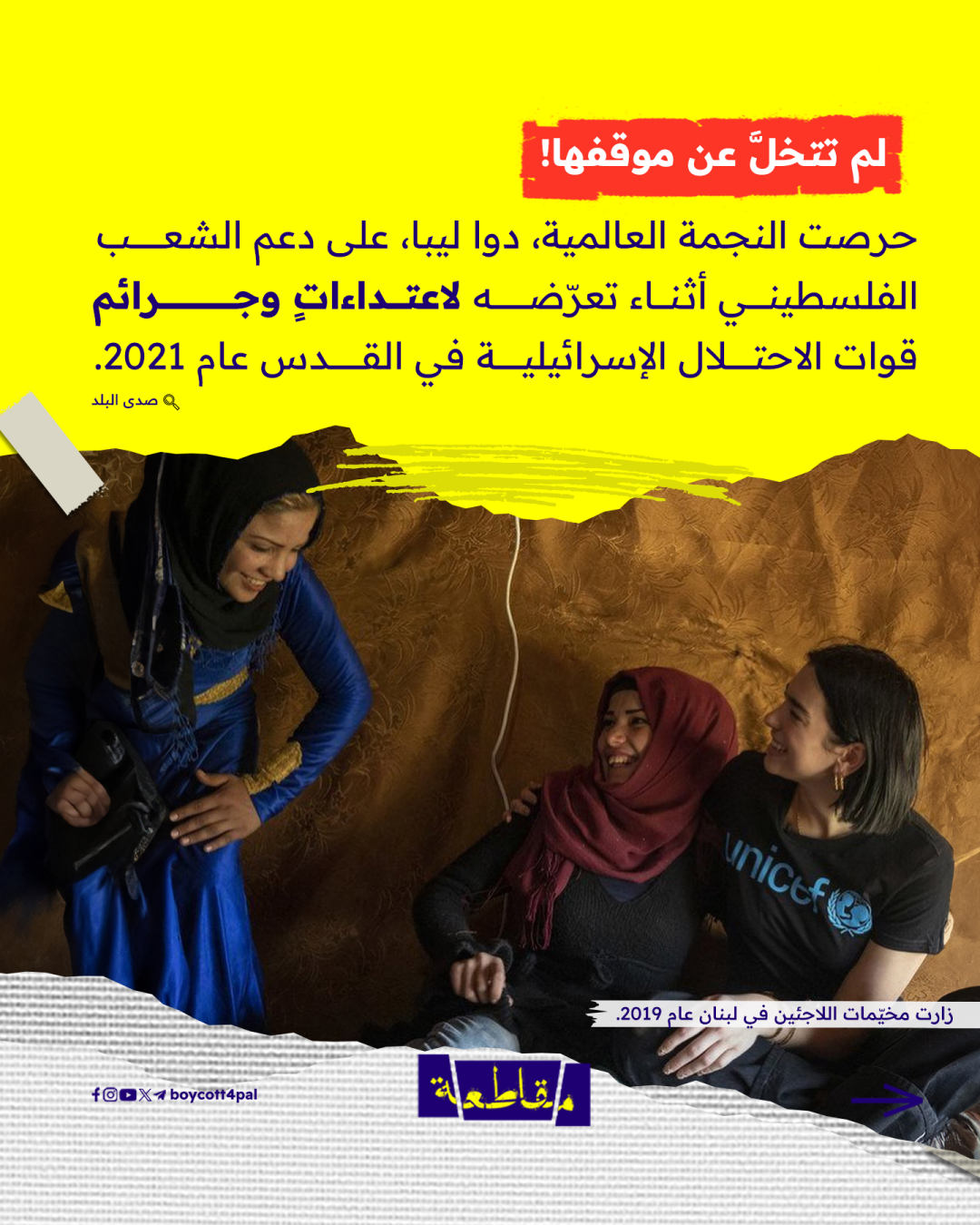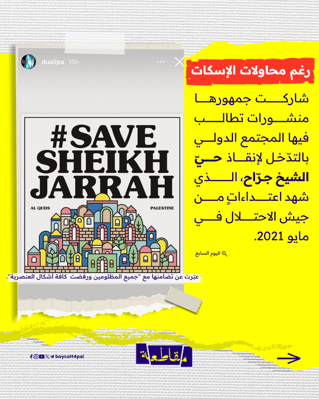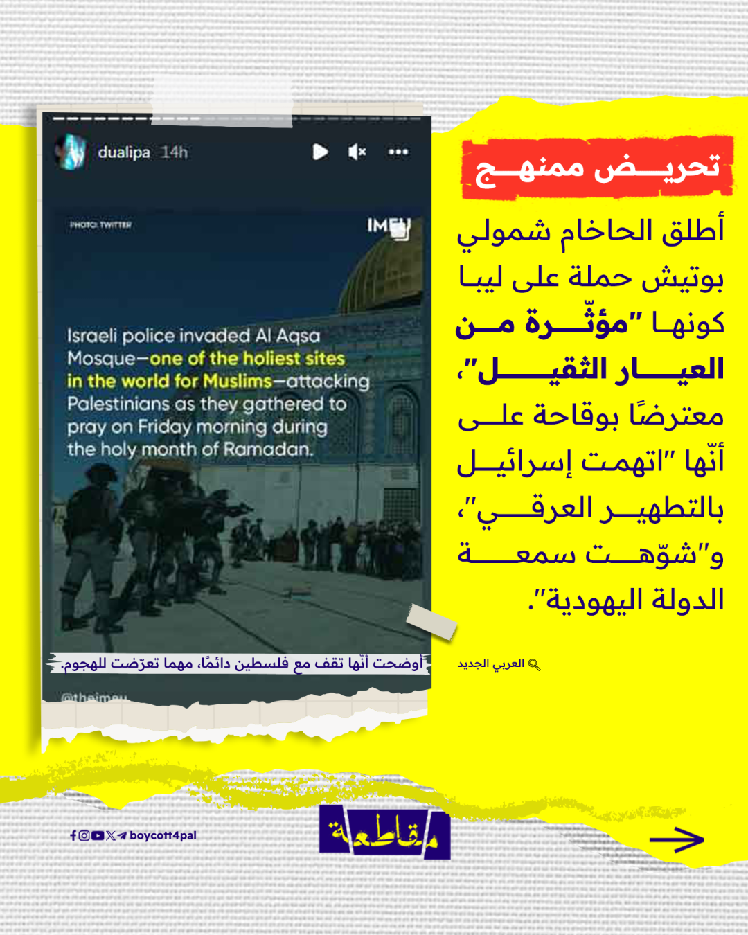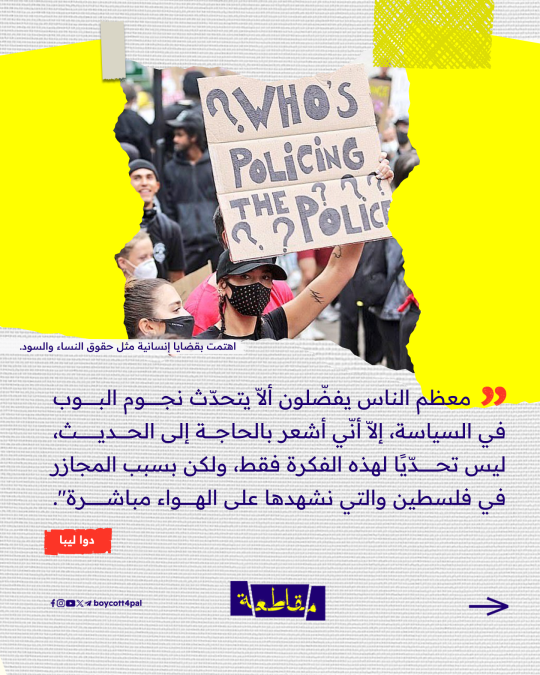 🟡 إلى جانب فنّها، إن أكثر ما جعل دوا ليبا قريبة من شعوب منطقتنا كان احتوائها لقضاياها ودعمها لحقوق أهلها، علمًا أنها تعرّضت لانتقادات واسعة لتعاقدها مع شركة “بوما” للألبسة والمستلزمات الرياضية، ما اعتبره البعض تورّطًا غير مباشر مع الاحتلال، وسط حملة شرسة لمقاطعة الشركة.