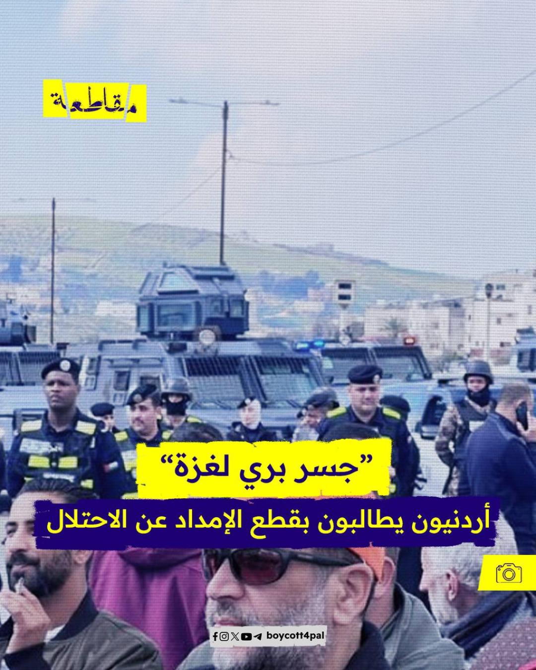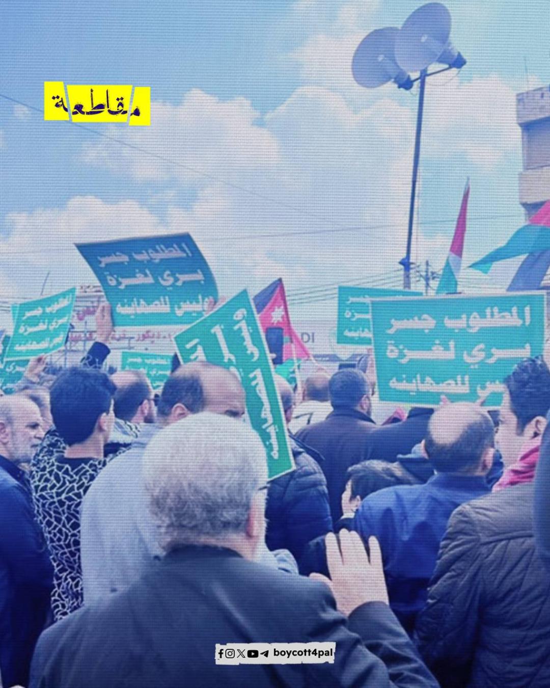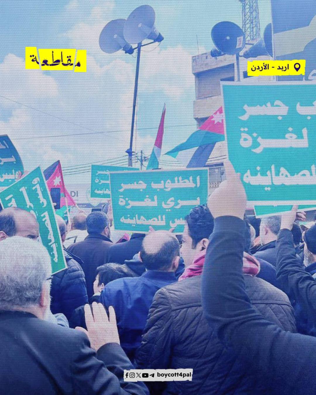 شهدت المملكة الأردنية تظاهرات سلمية كبيرة، ضد الجسر البري لنقل البضائع لكيان الاحتلال الإسرائيلي دعا إليها الملتقى الوطني لدعم المقاومة وحماية الوطن، وقامت قوات الأمن بإغلاق الطرق المؤدية إلى جسر الشيخ حسين لمنع المشاركين من الوصول للمنطقة الحدودية.