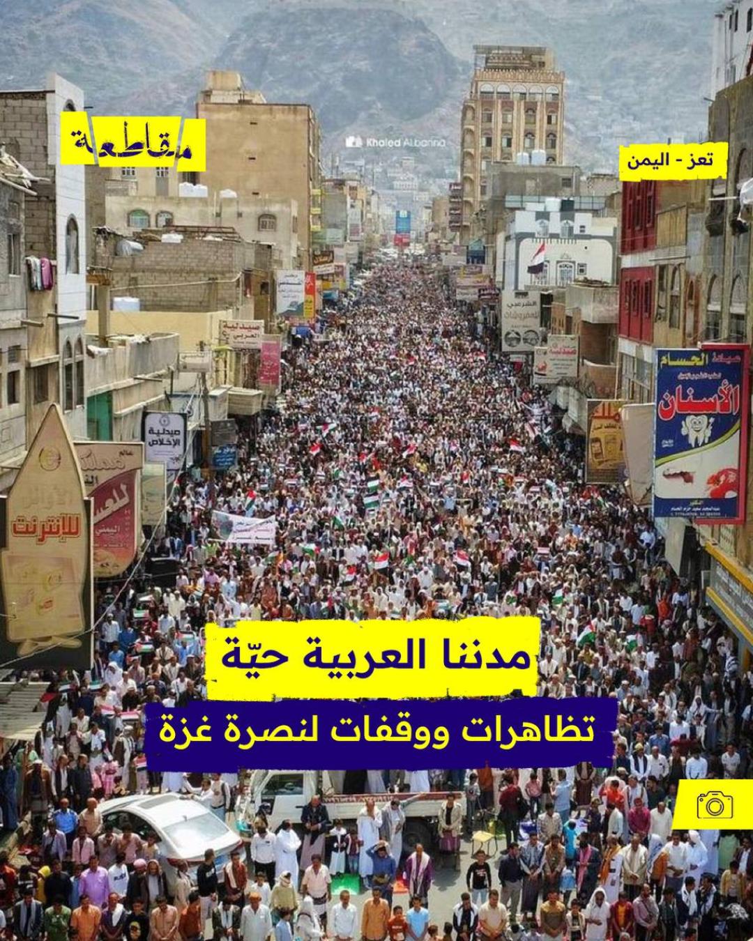 شهدت الجمعة، عدة مدن عربية منها 54 مدينة مغربية ومدن أردنية ويمنية تظاهرات ووقفات تضامنية مع الشعب الفلسطيني، للمطالبة بوقف الغارات الإسرائيلية على غزة، ولرفع الحصار وإدخال المساعدات.