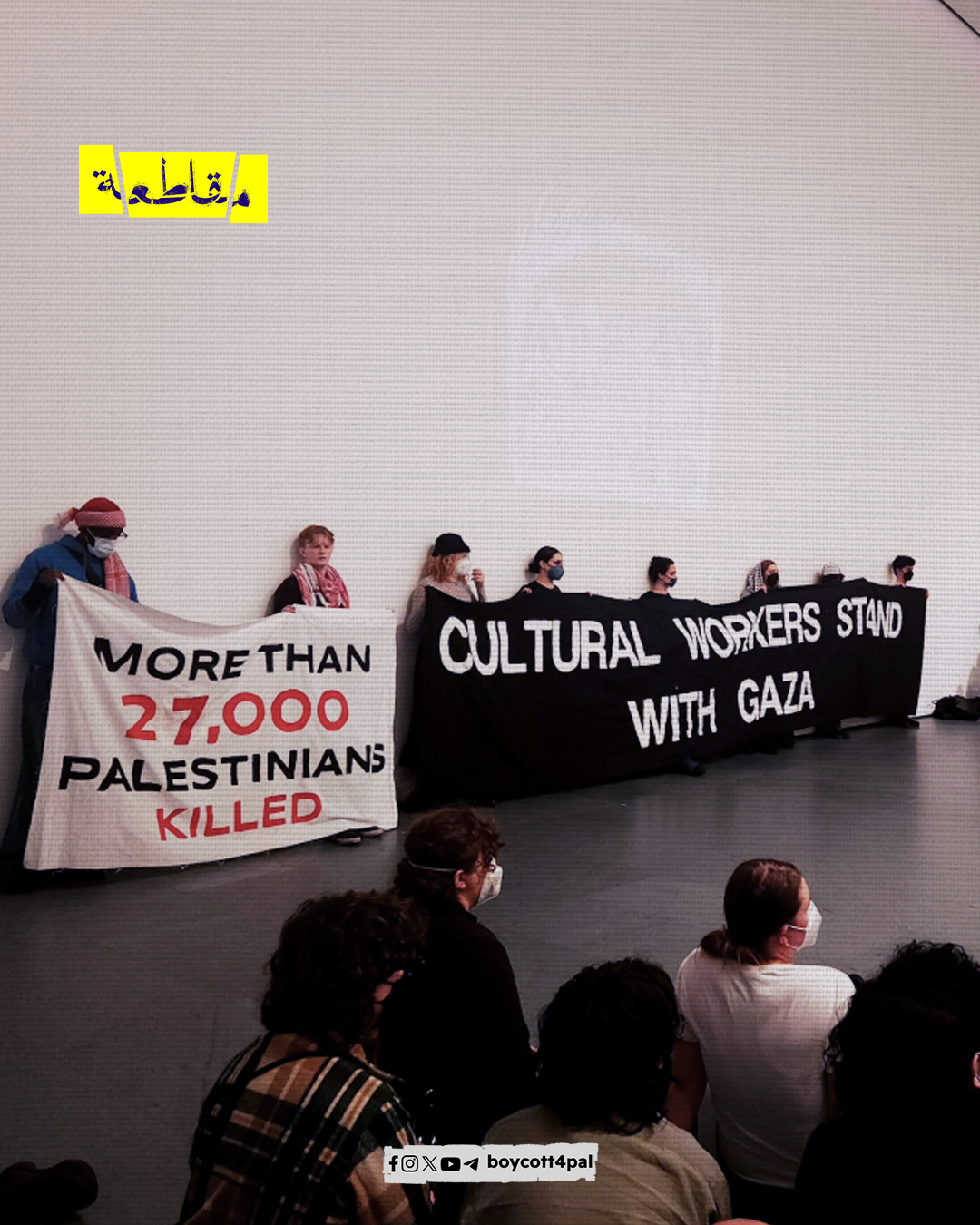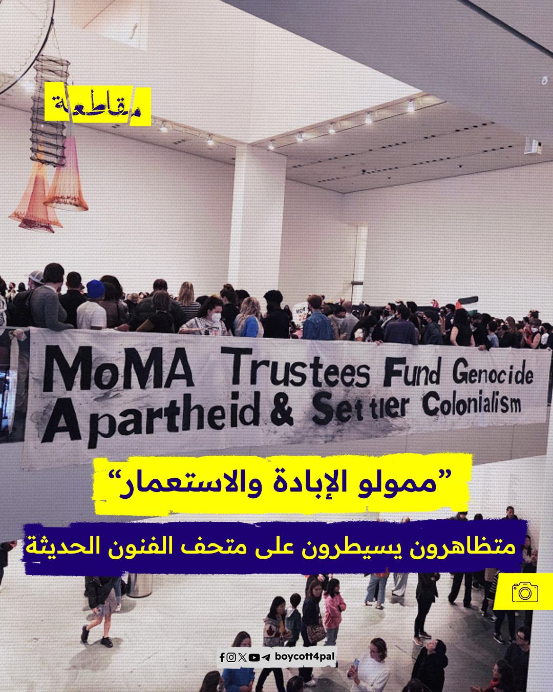 ورفعوا لافتة من الطابق الثاني تطل على ردهة المتحف والمخرج الخلفي كتب عليها “أمناء متحف الفن الحديث يمولون الإبادة الجماعية والفصل العنصري والاستعمار الاستيطاني”.