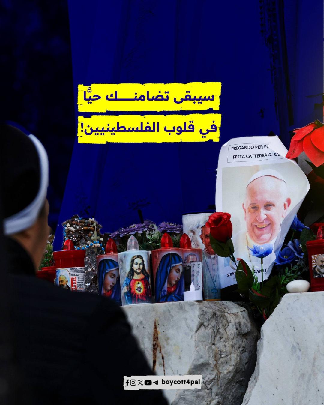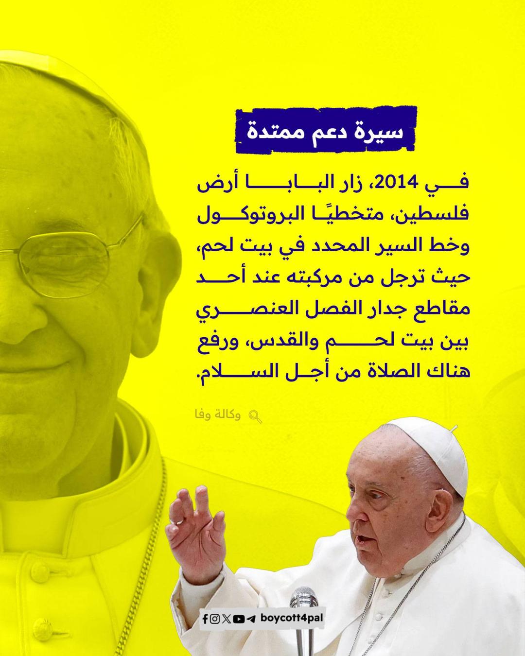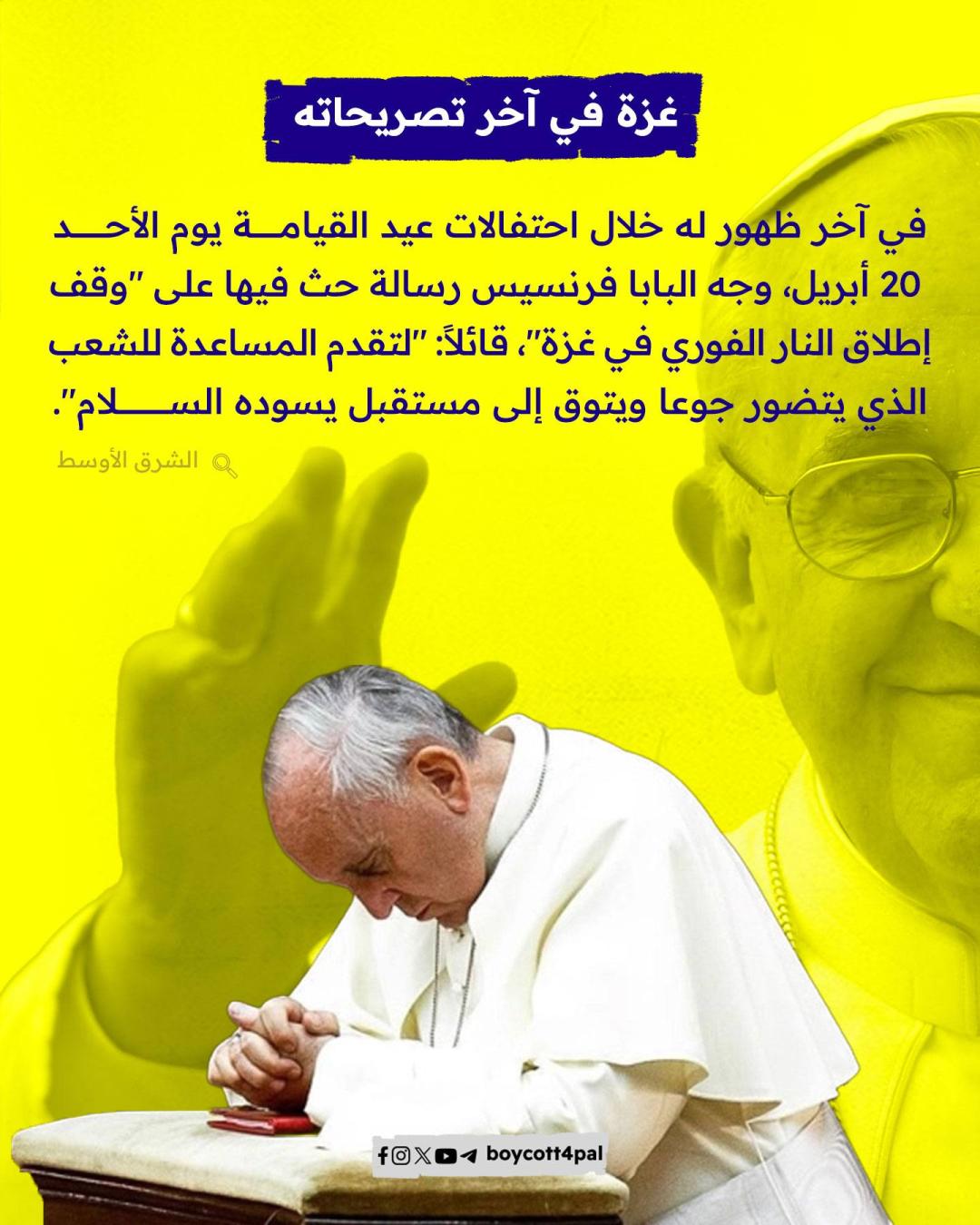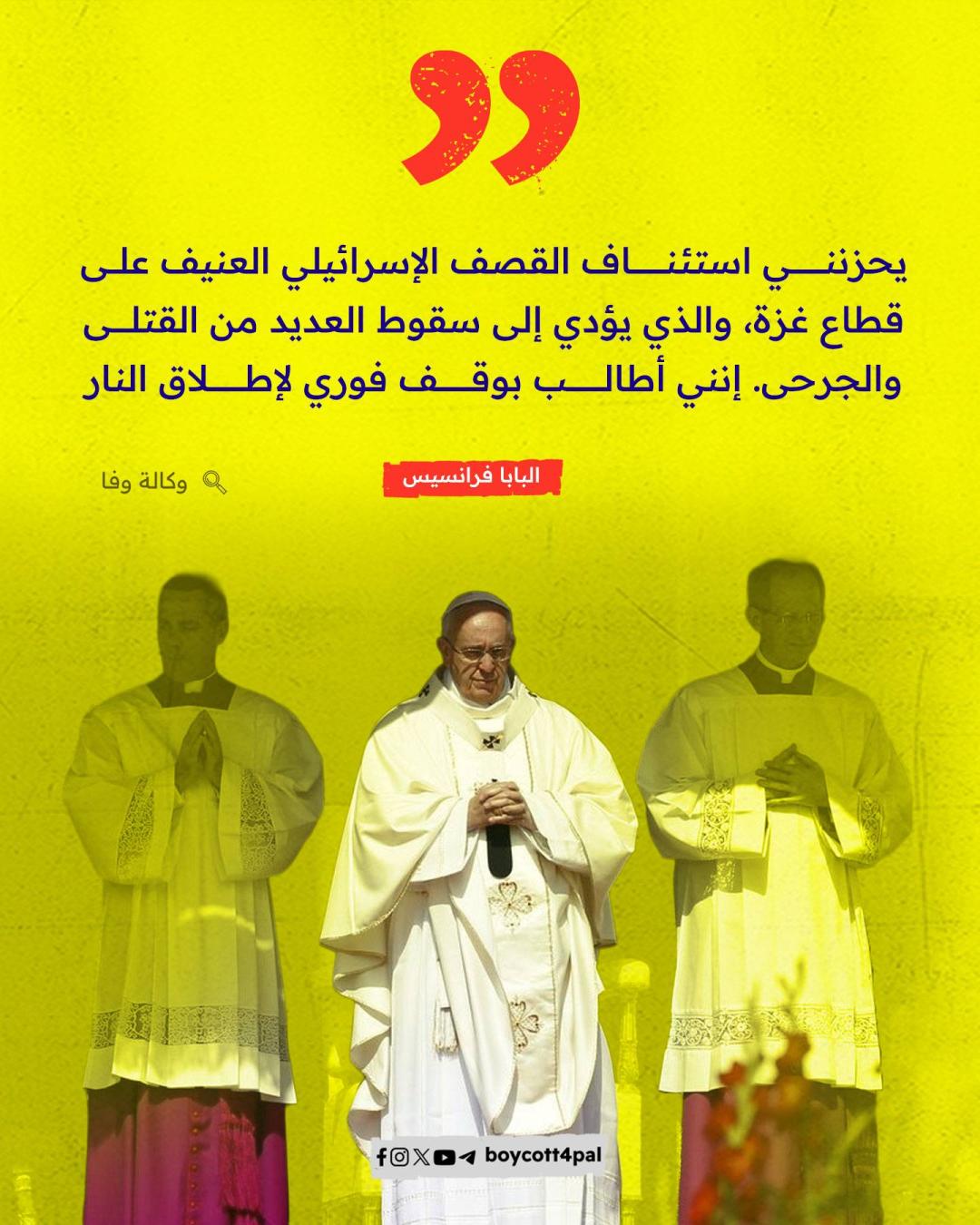 أعلن المكتب الصحفي للفاتيكان مساء الاثنين 21 أبريل وفاة بابا الكنيسة الكاثوليكية، البابا فرانسيس "خورخي ماريو بيرجوليو" عن عمر يناهز 88 عامًا. ونستعرض في هذه المادة: كيف عبّر البابا فرانسيس عن تضامنه مع الشعب الفلسطيني طوال سنوات بابويته؟