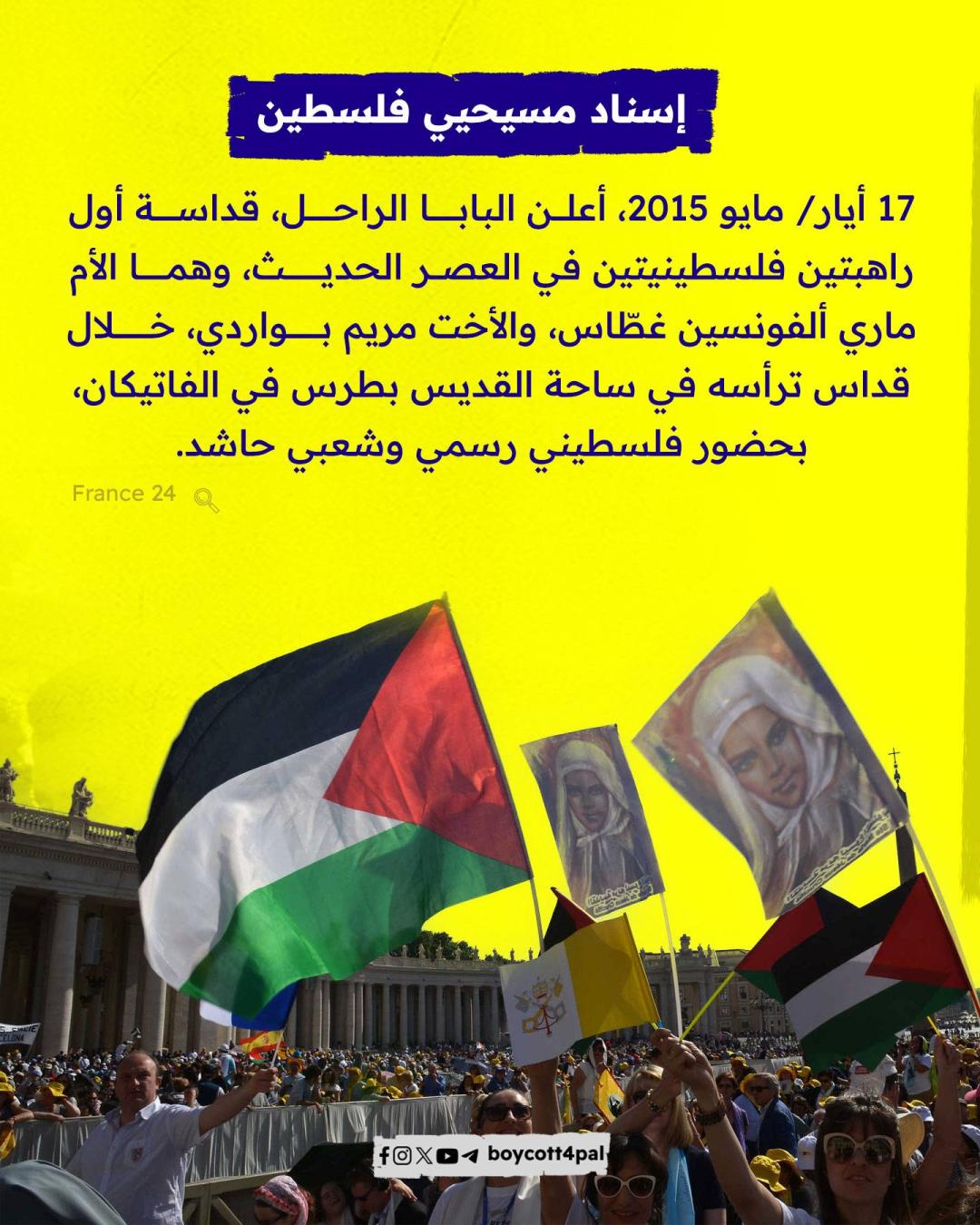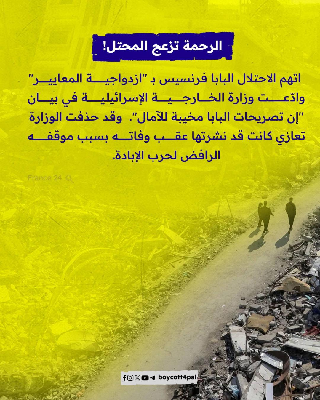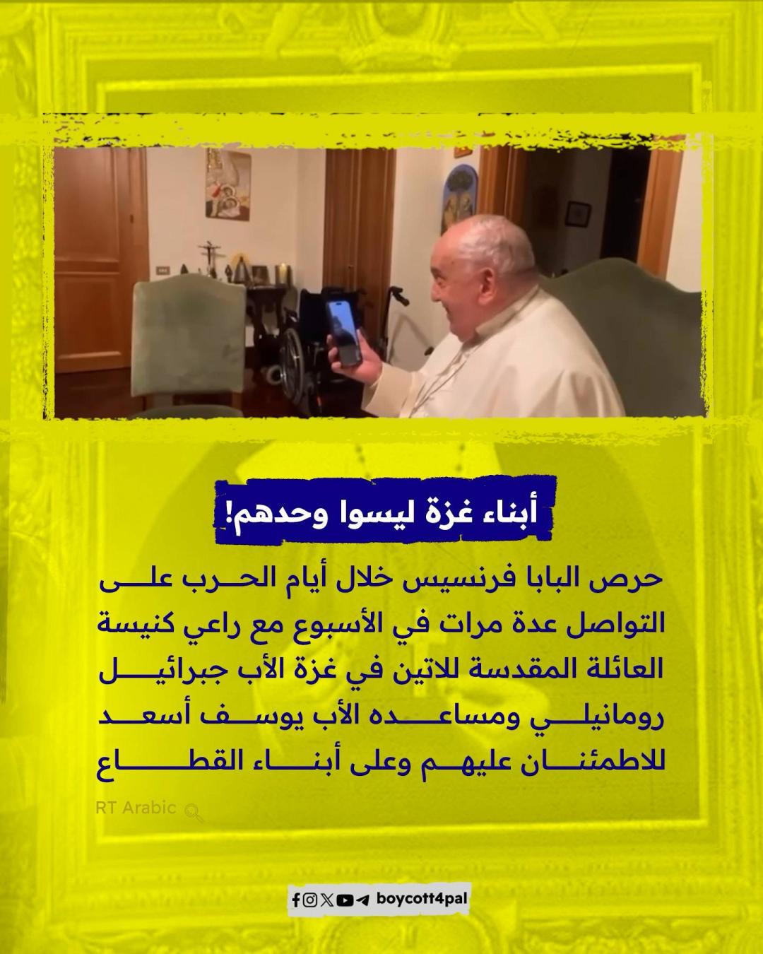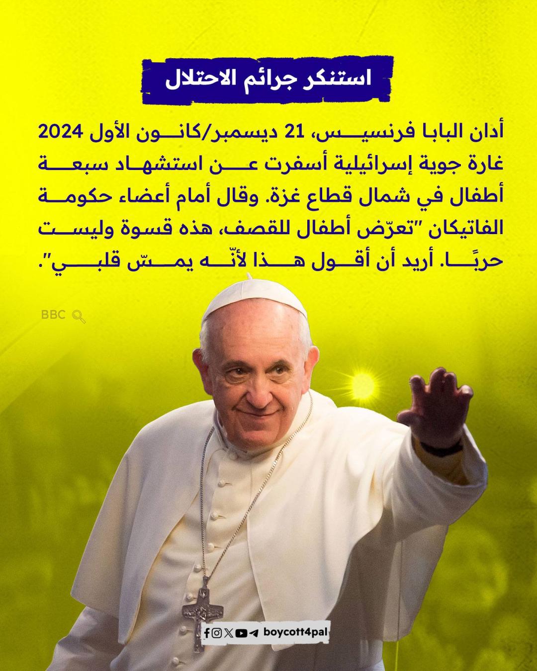 أعلن المكتب الصحفي للفاتيكان مساء الاثنين 21 أبريل وفاة بابا الكنيسة الكاثوليكية، البابا فرانسيس "خورخي ماريو بيرجوليو" عن عمر يناهز 88 عامًا. ونستعرض في هذه المادة: كيف عبّر البابا فرانسيس عن تضامنه مع الشعب الفلسطيني طوال سنوات بابويته؟