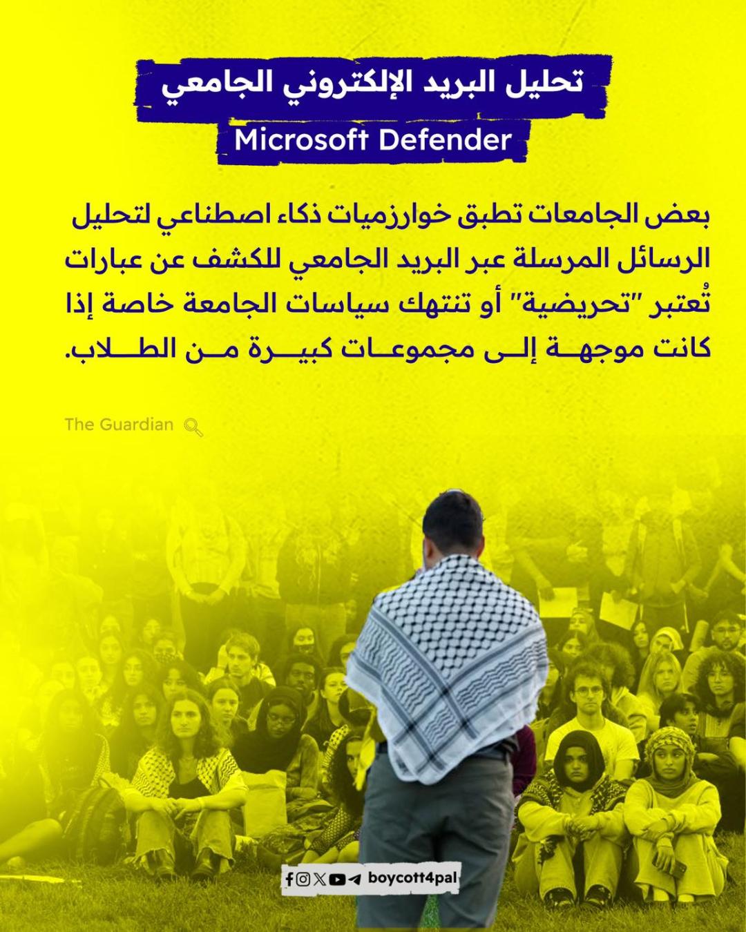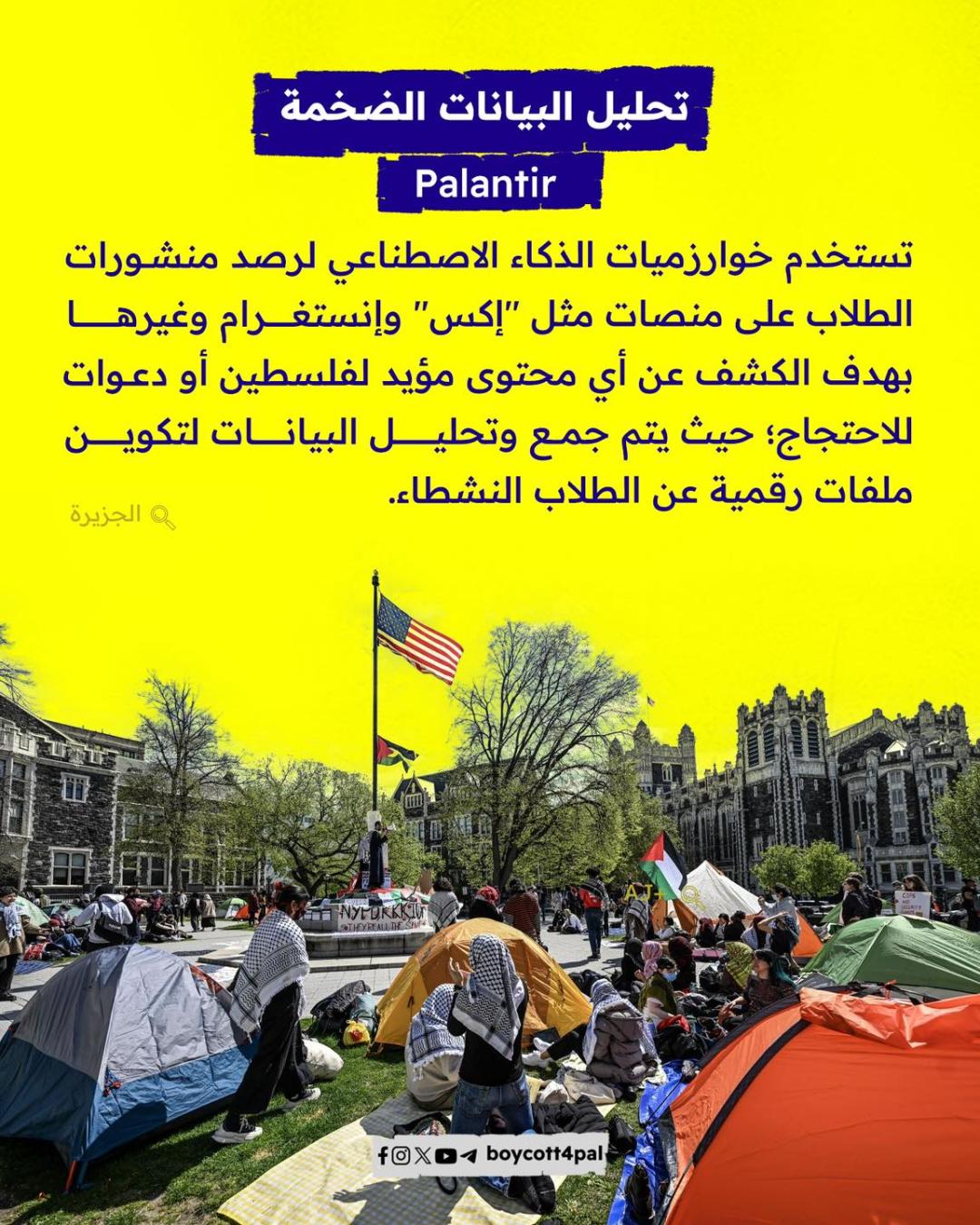 تستخدم الجامعات الأمريكية الذكاء الاصطناعي كأداة رقابية لقمع حرية التعبير لدى الطلاب، خصوصًا أولئك الذين يشاركون في أنشطة سياسية أو يعبرون عن مواقف مناصرة لقضايا إنسانية مثل دعم فلسطين. وتُبرر هذه الممارسات تحت شعارات زائفة كـ الأمن" أو "الاستقرارالجامعي"، بينما هي في جوهرها استجابة لضغوط سياسية وإعلامية تهدف إلى إسكات أصوات الطلبة والتضييق على حريتهم في التنظيم والاحتجاج.