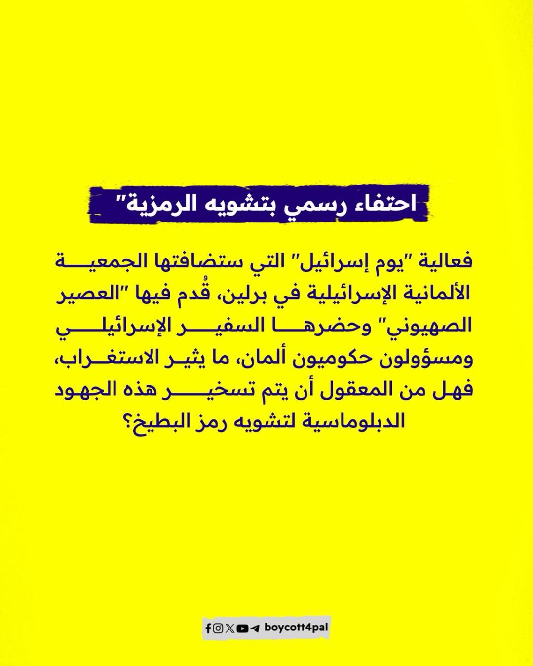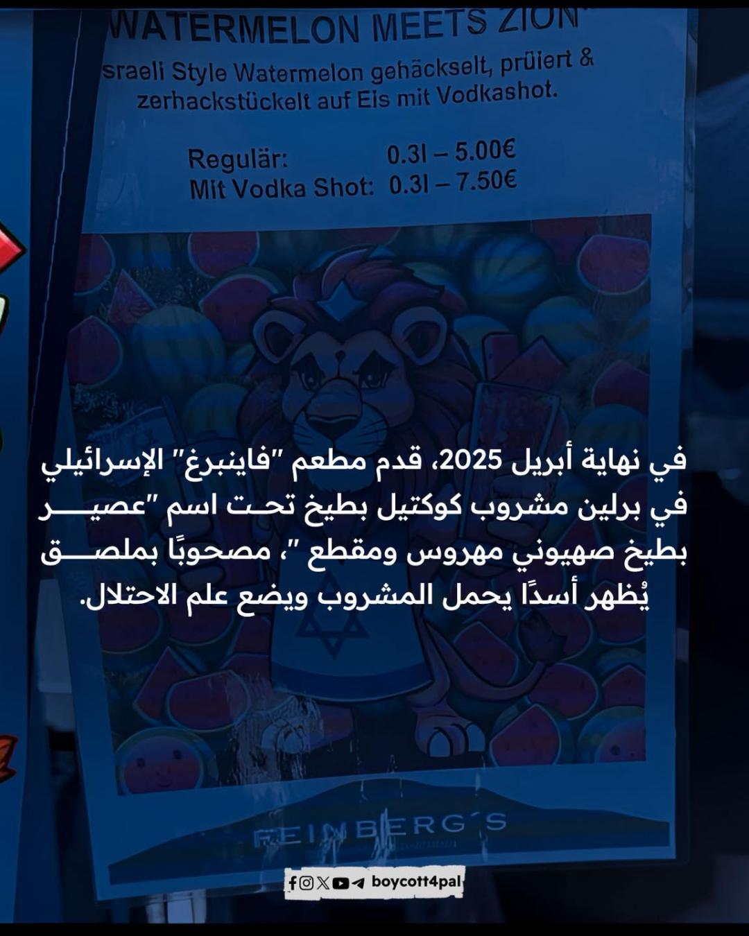 في وقتٍ يجتمع فيه السفراء والمسؤولون للاحتفاء بـ"بطيخة مهروسة"، ويتفاخرون بارتكاب المجازر في غزة، يحاولون تشويه رمز المقاومة بملصق كوكتيل، لكن البطيخة التي قاومت المنع والطمس منذ 1967، أسمى من أن تُهرس في كأس دعاية رخيصة.