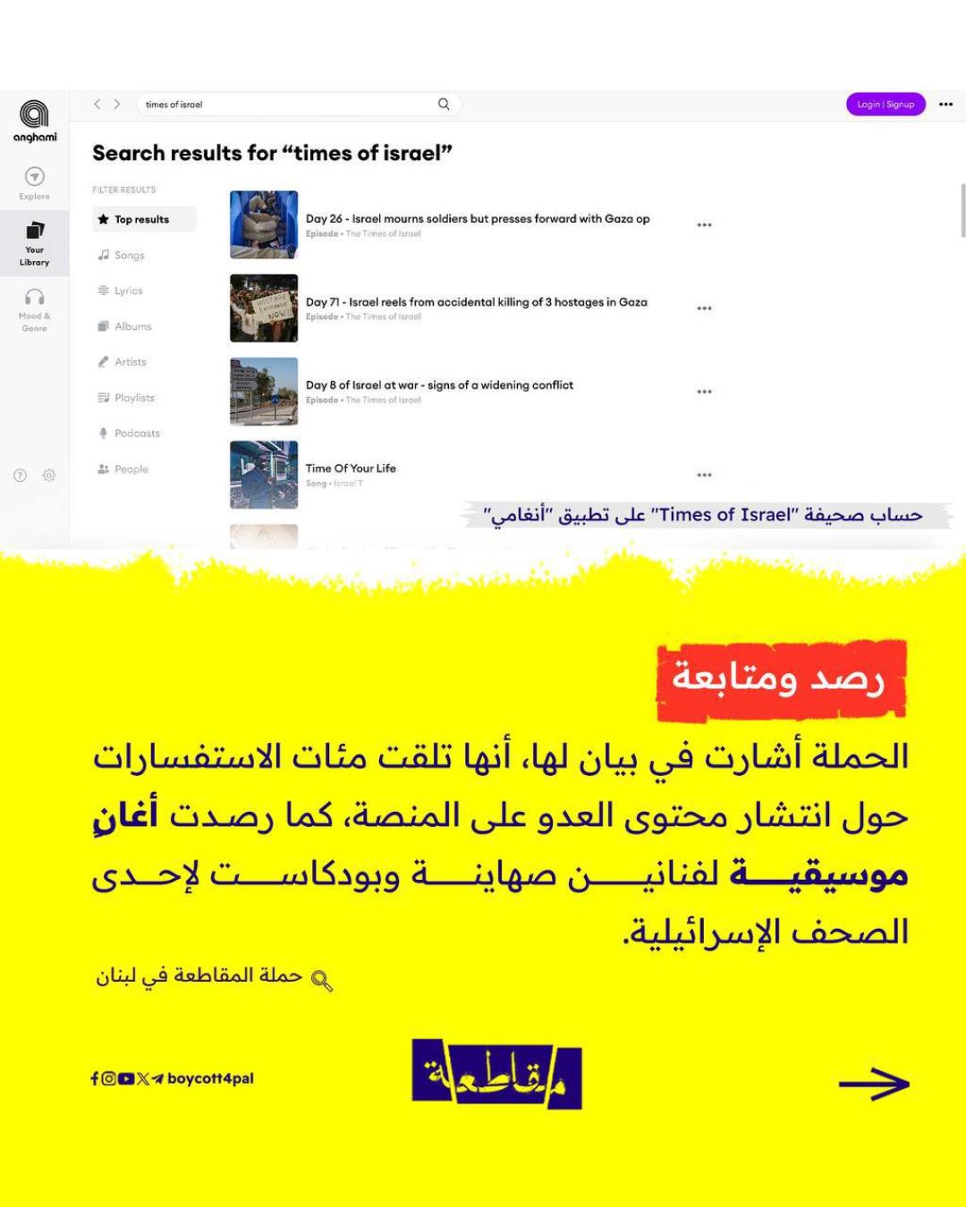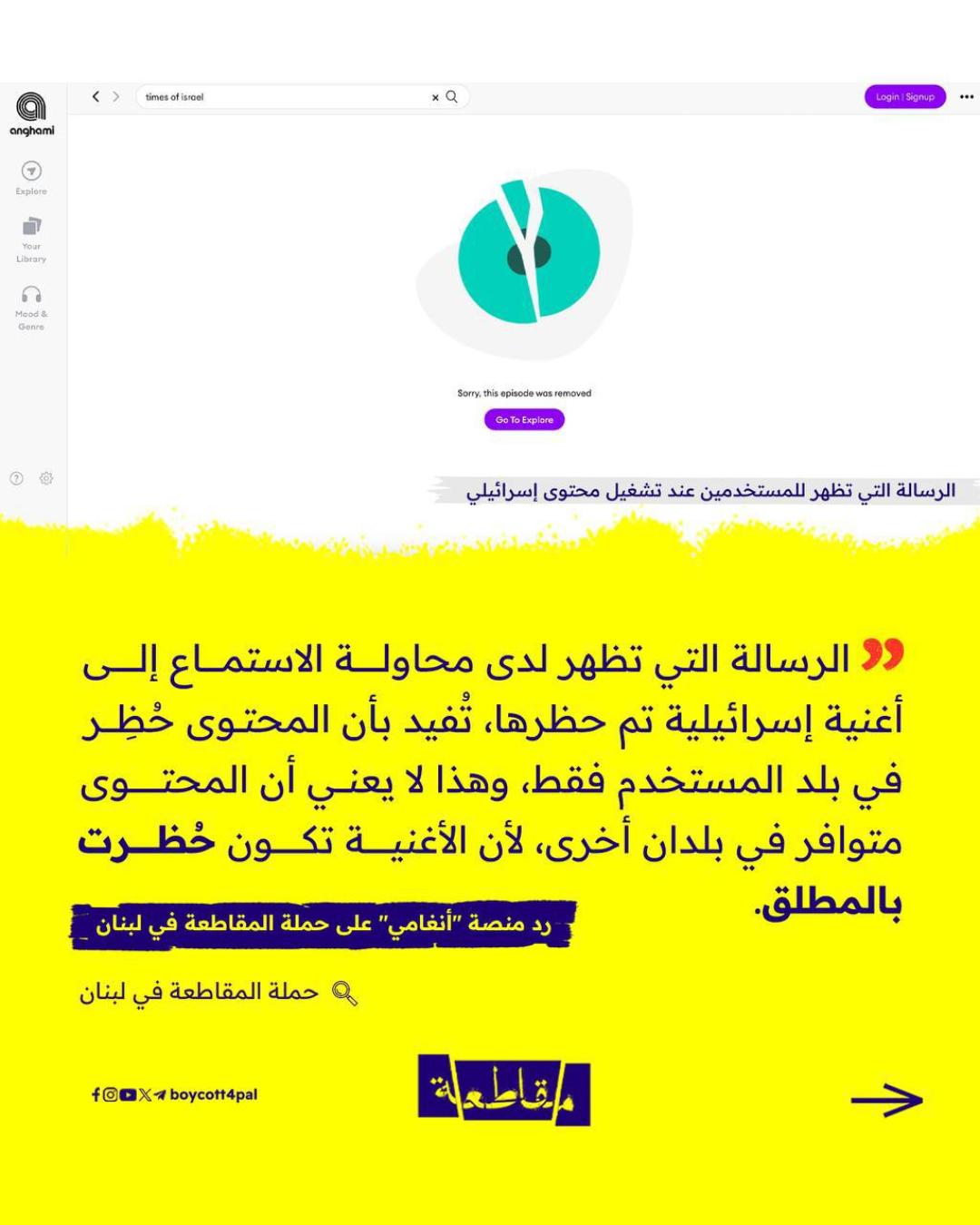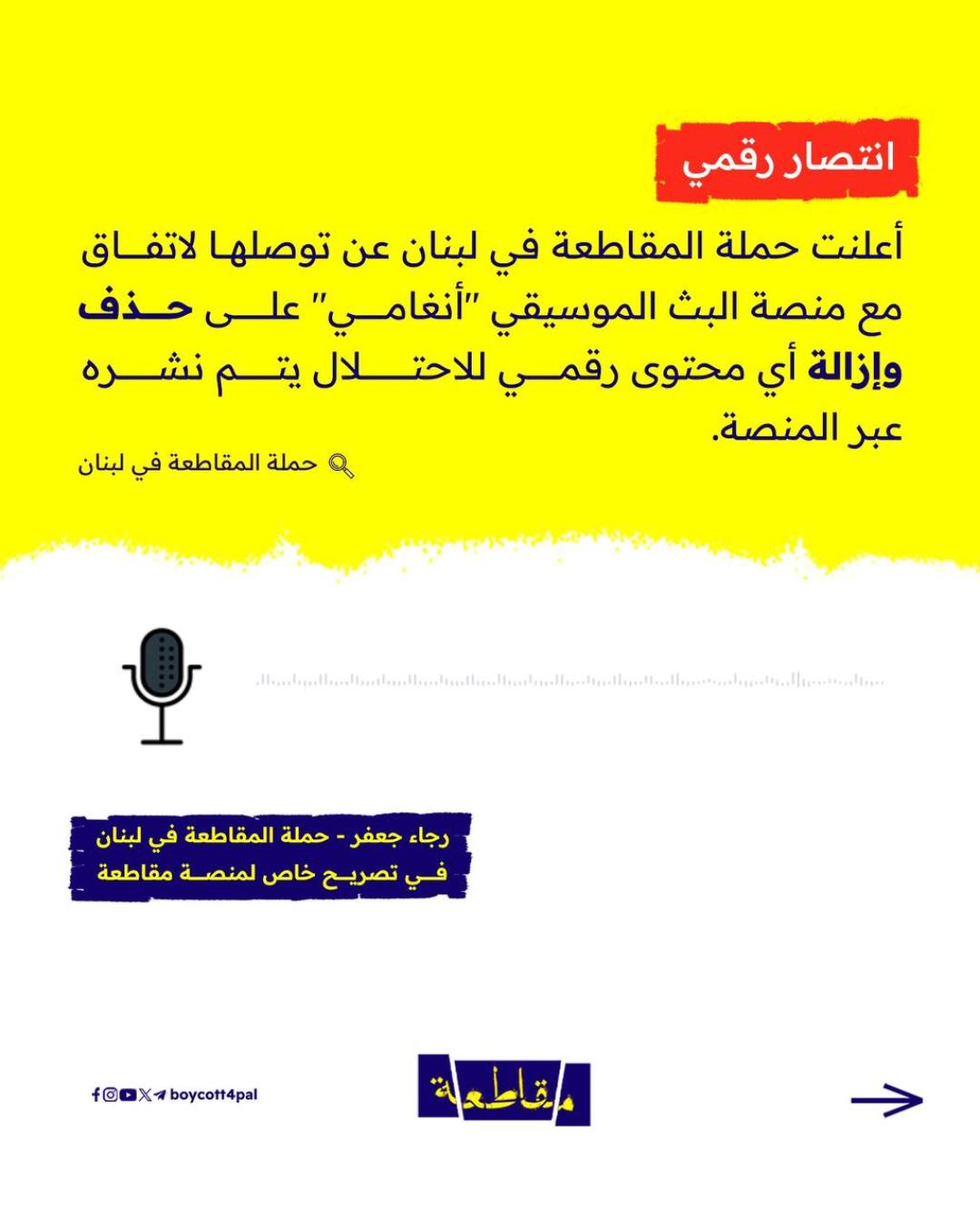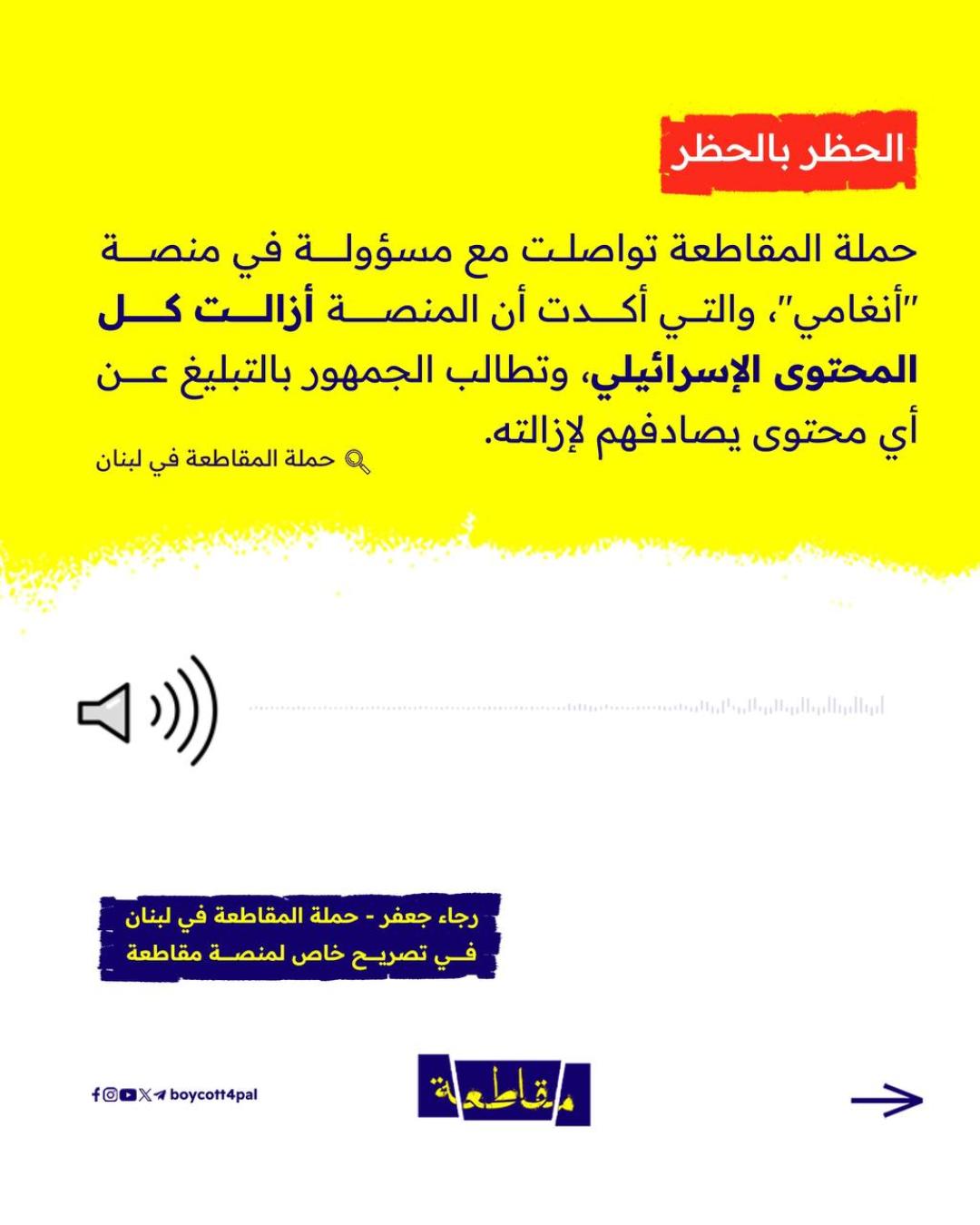 هل قررت منصة “أنغامي” حظر أي محتوى إسرائيلي ينشر عبرها؟ في هذا اللقاء الخاص مع منصة مقاطعة، حملة المقاطعة في لبنان تكشف عن تفاصيل حملتها لاستهداف وإزالة محتوى العدو عن منصة “أنغامي” وكيف تجاوبت معها المنصة.