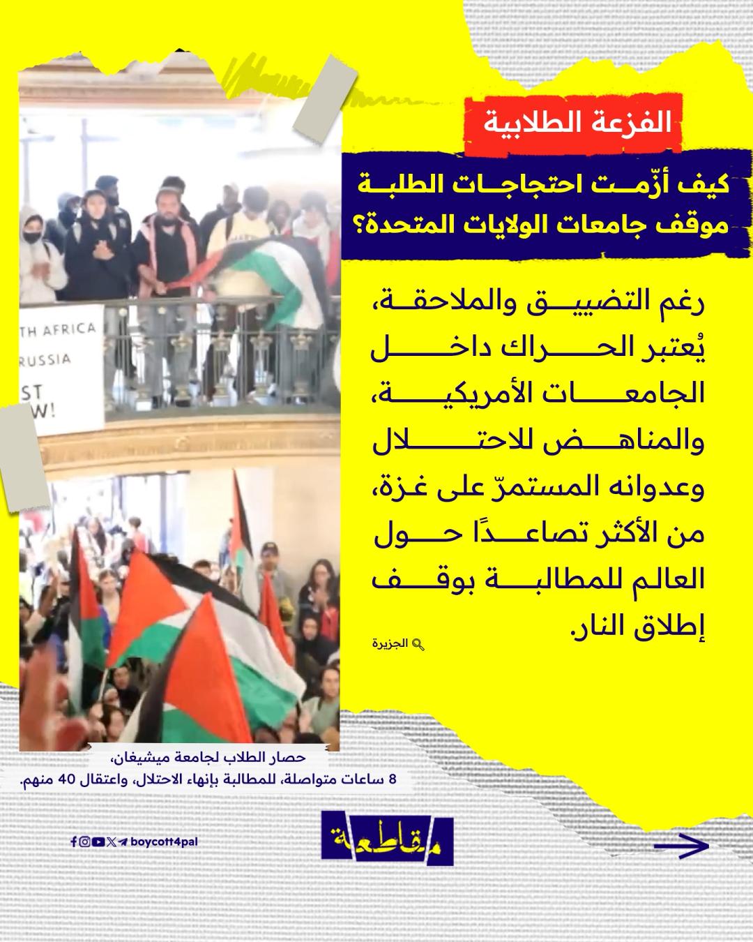 وتدعو العريضة التي وزعها الطلاب، جامعة ولاية أريزونا إلى مقاطعة الشركات المملوكة لإسرائيليين وسحب الاستثمارات منها، بما في ذلك المنتجات الموجودة في متاجر الحرم الجامعي، كما دعت إلى إنهاء برامج الدراسة في “إسرائيل”.