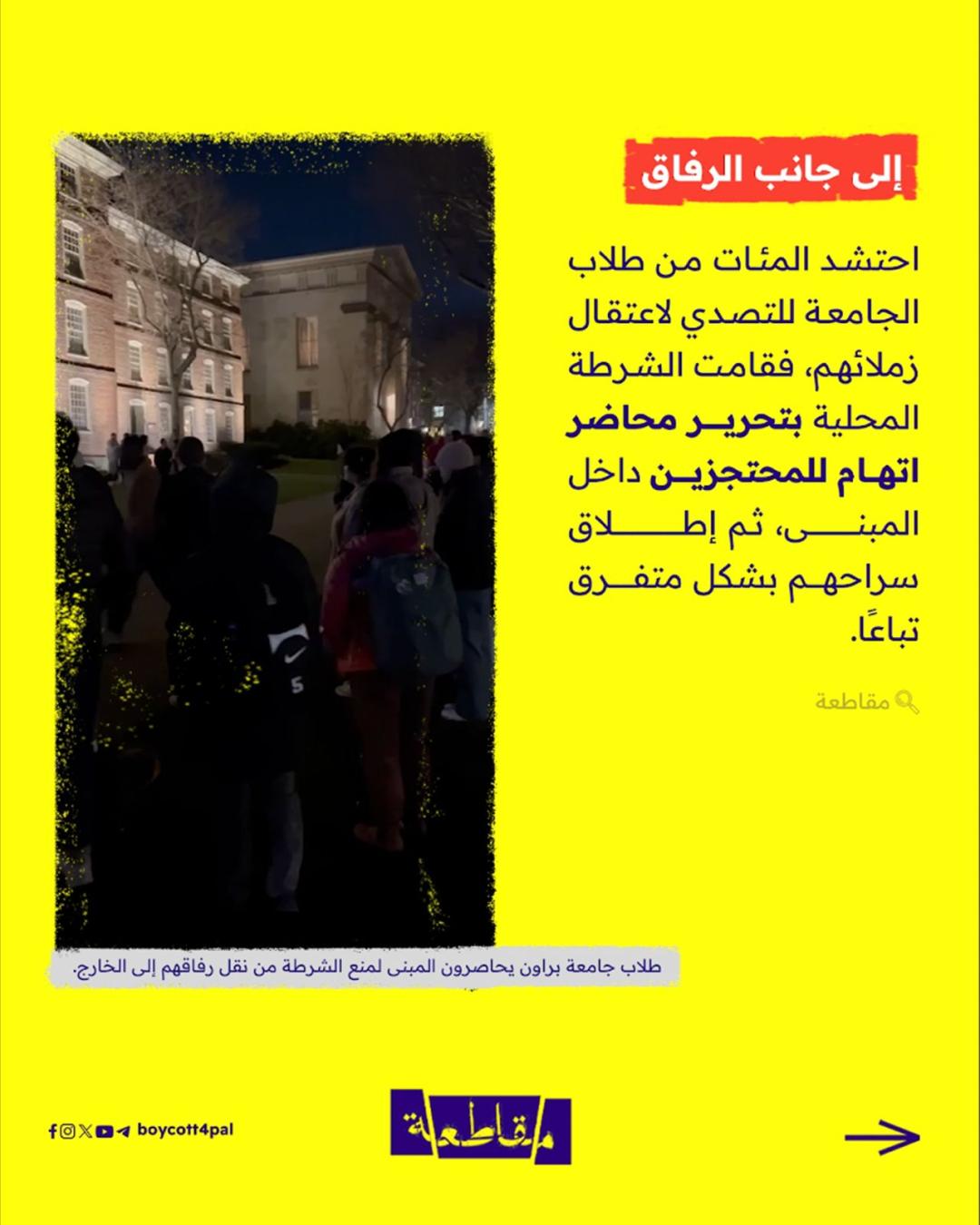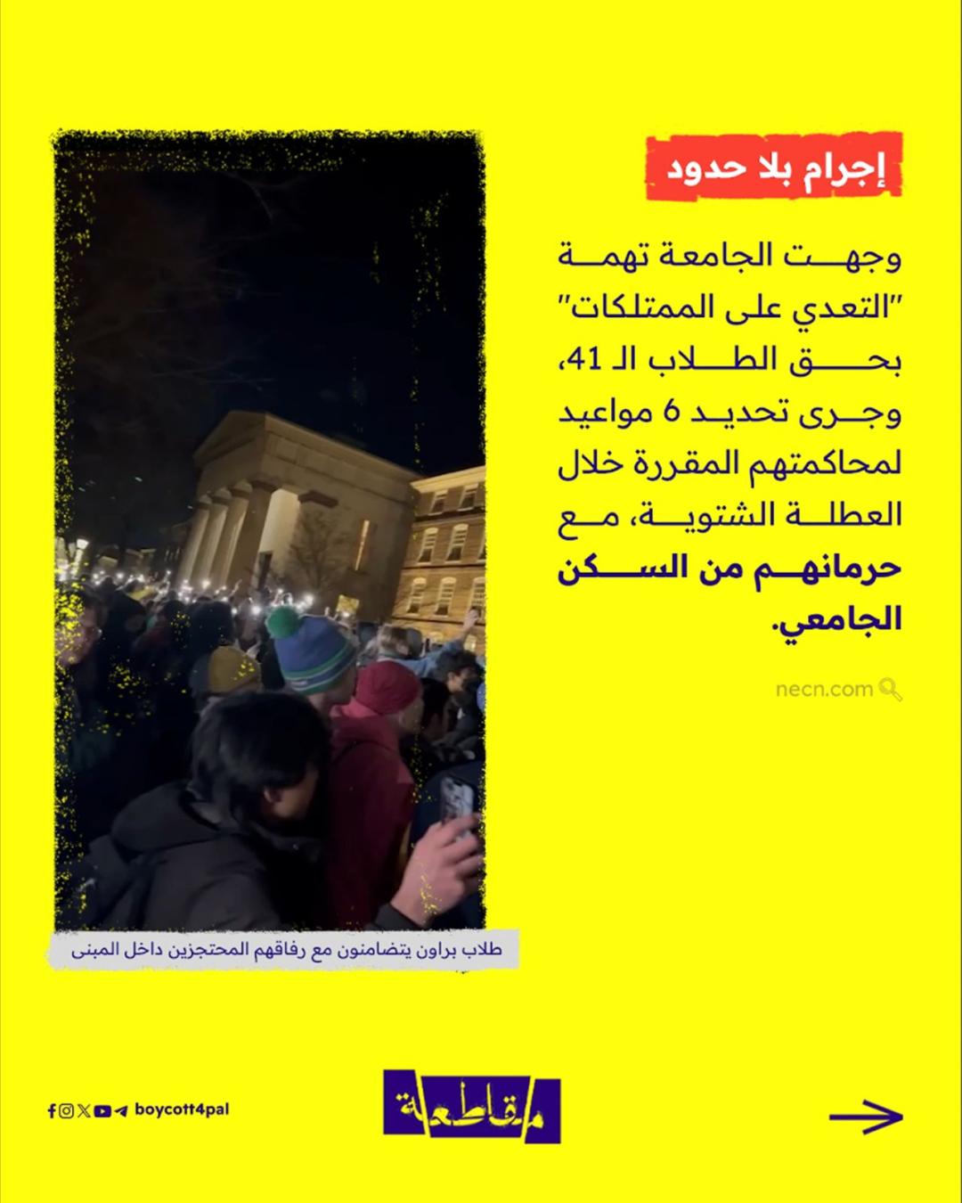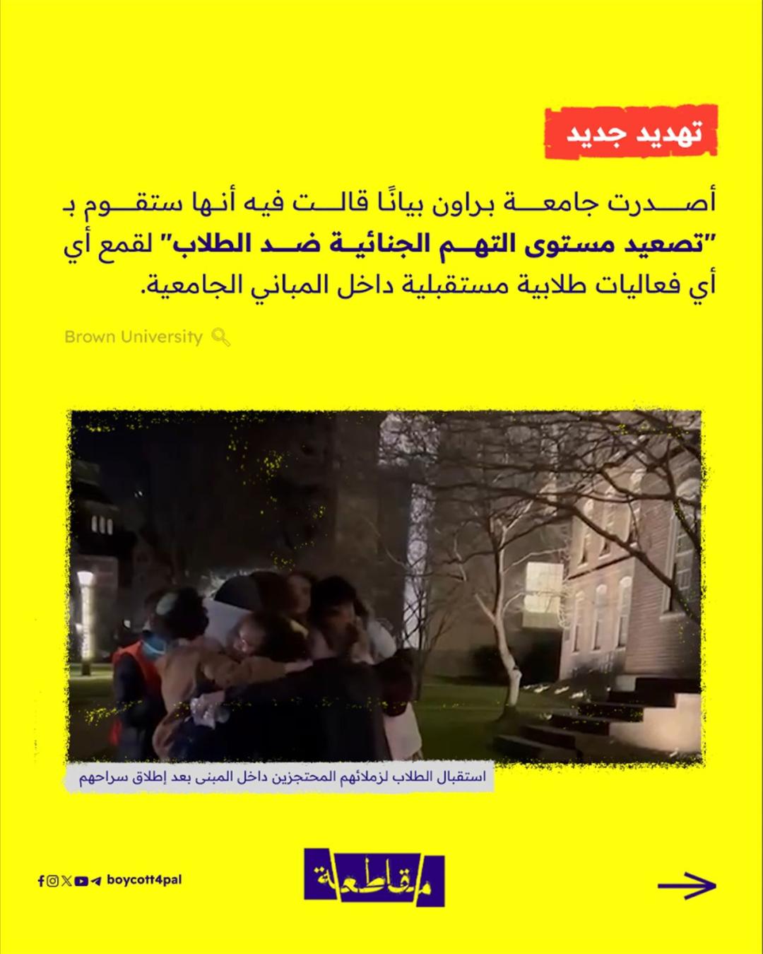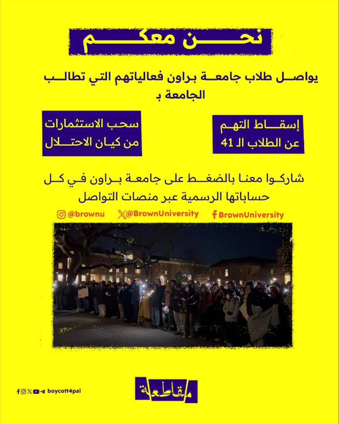 هذه دعوة لكم جميعًا، للوقوف في صف أنصار فلسطين من طلاب جامعة براون الأمريكية، والضغط غللا الجامعة في كافة حساباتها على منصات التواصل، لإجبارها على إسقاط التهم الجنائية التي وجتها لـ 41 من طلابها، وسحب استثماراتها من كيان الاحتلال.