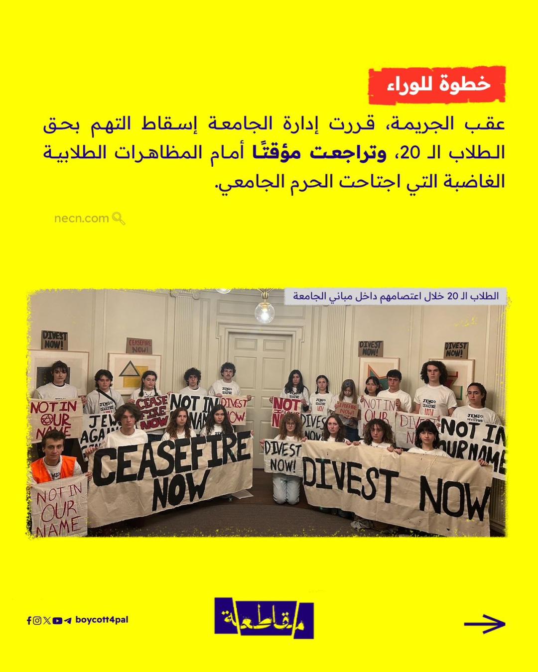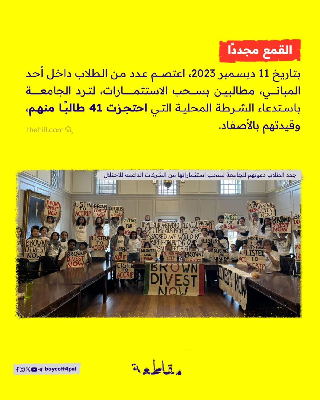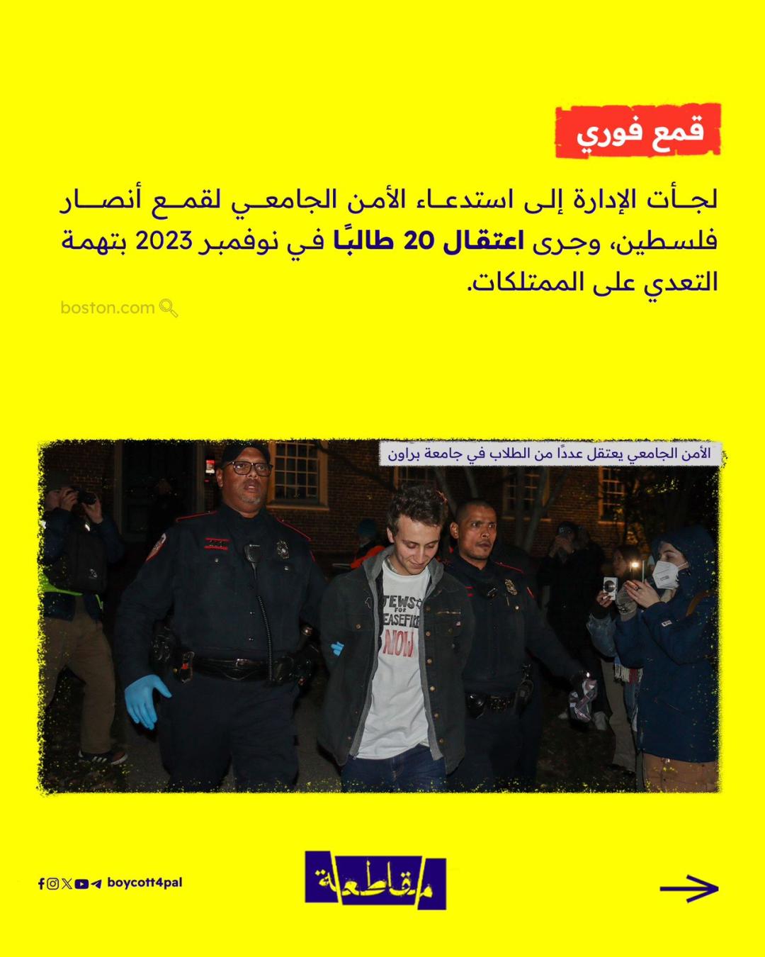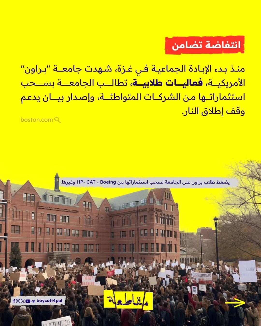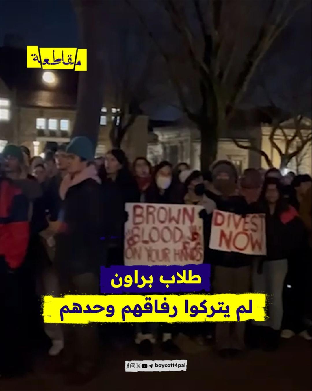 هذه دعوة لكم جميعًا، للوقوف في صف أنصار فلسطين من طلاب جامعة براون الأمريكية، والضغط غللا الجامعة في كافة حساباتها على منصات التواصل، لإجبارها على إسقاط التهم الجنائية التي وجتها لـ 41 من طلابها، وسحب استثماراتها من كيان الاحتلال.
