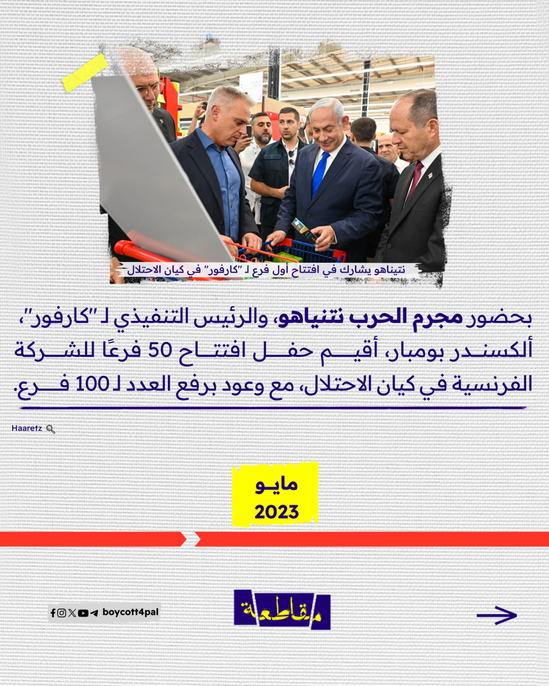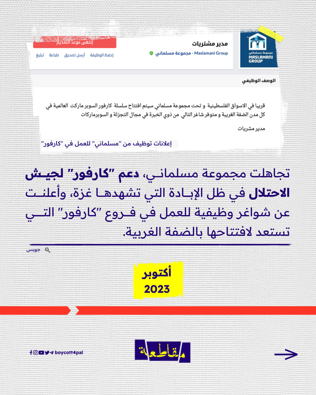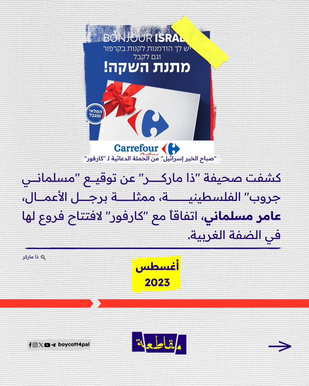 متجاهلة حملات المقاطعة الواسعة حول العالم لـ “كارفور”، ودعم الشركة الفرنسية العلني لجيش الاحتلال في جريمة الإبادة الجماعية المتواصلة بحق شعبنا في #غزة، تمضي “مجموعة مسلماني” في صفقة افتتاح فروع للشركة الفرنسية في مدن الضفة الغربية.