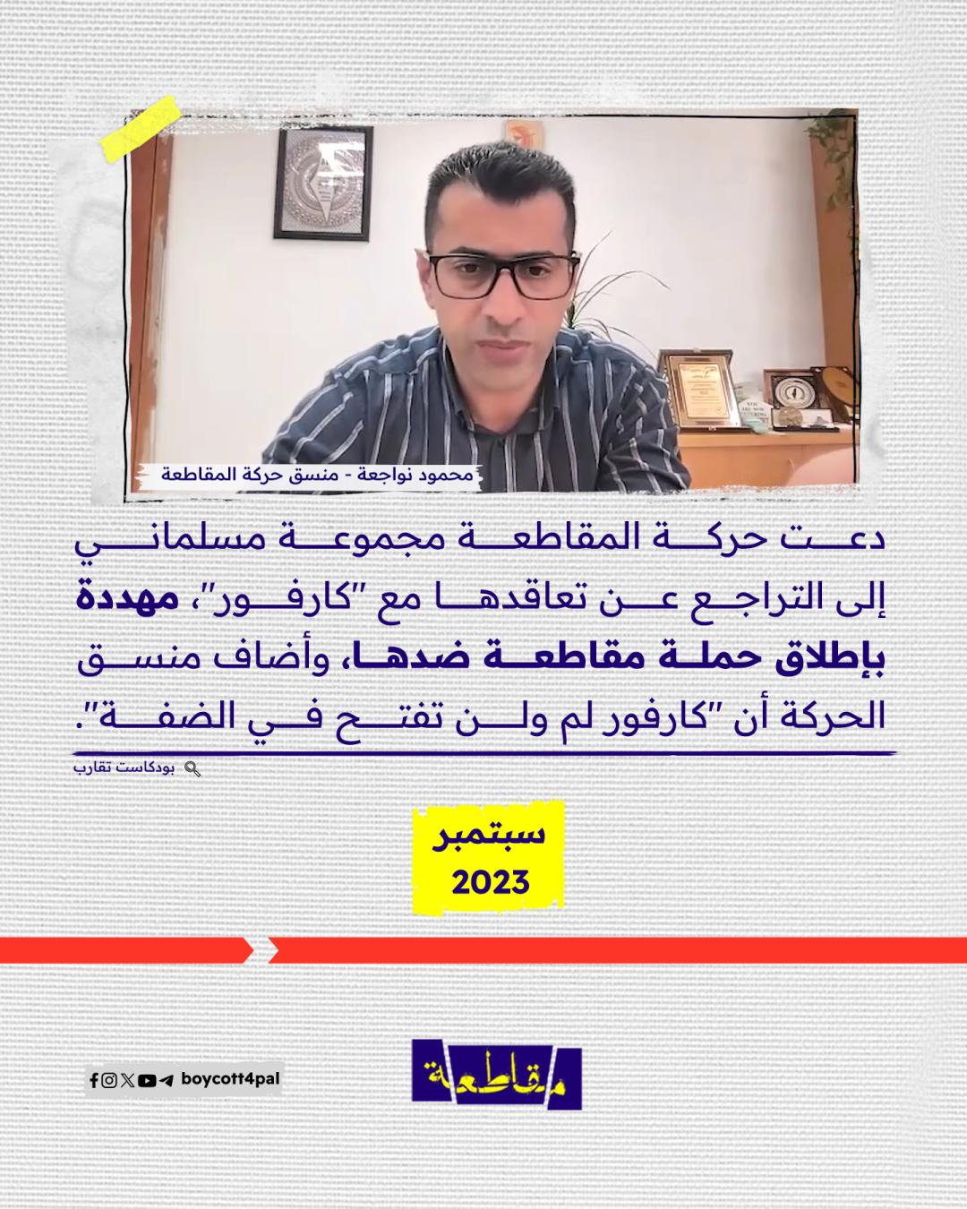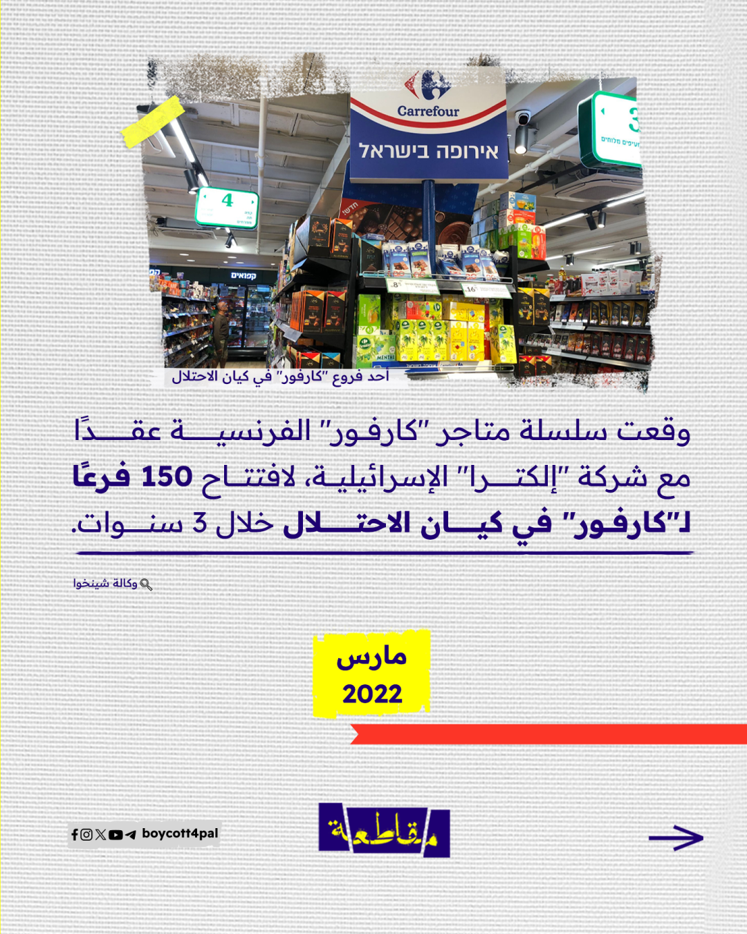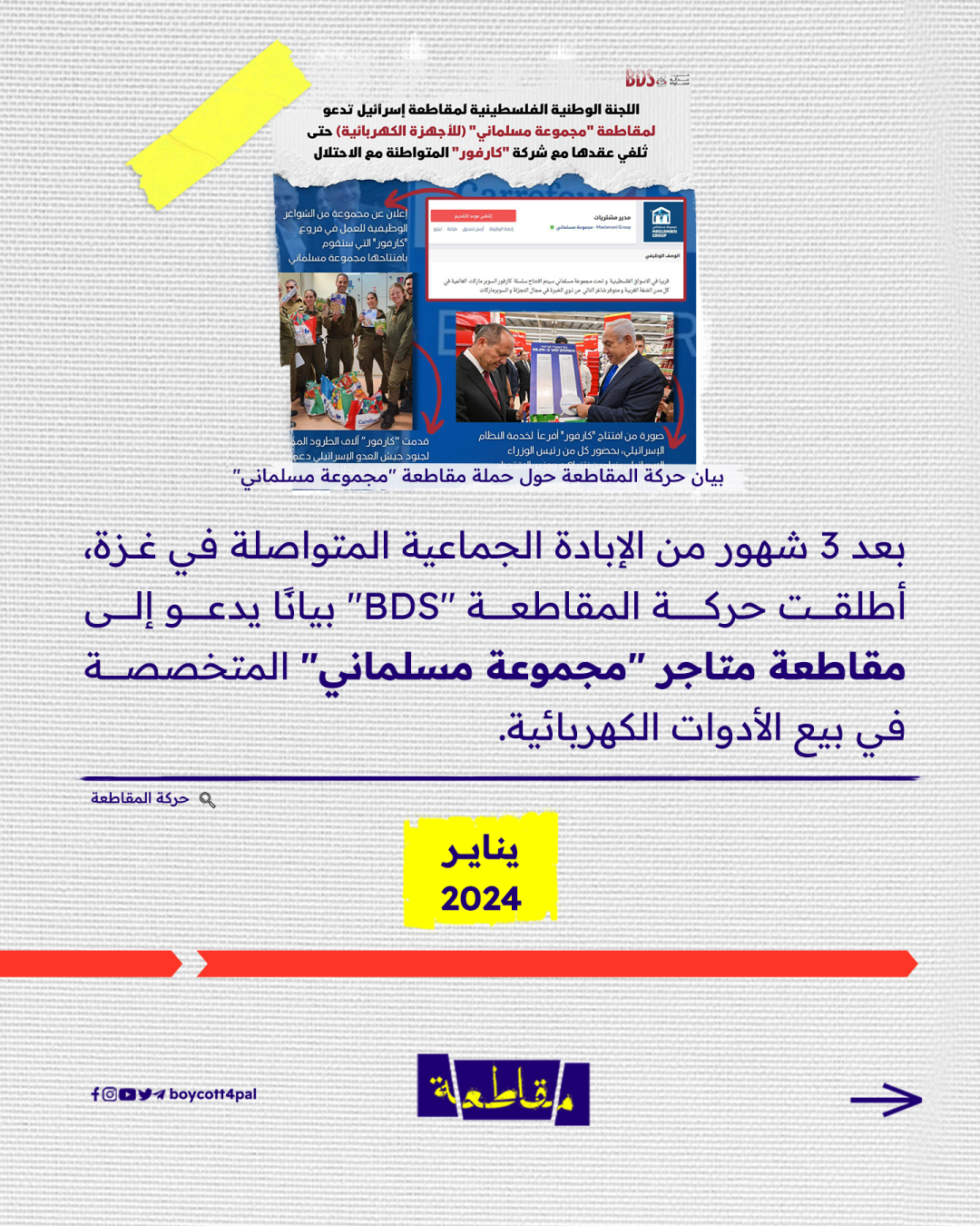 متجاهلة حملات المقاطعة الواسعة حول العالم لـ “كارفور”، ودعم الشركة الفرنسية العلني لجيش الاحتلال في جريمة الإبادة الجماعية المتواصلة بحق شعبنا في #غزة، تمضي “مجموعة مسلماني” في صفقة افتتاح فروع للشركة الفرنسية في مدن الضفة الغربية.