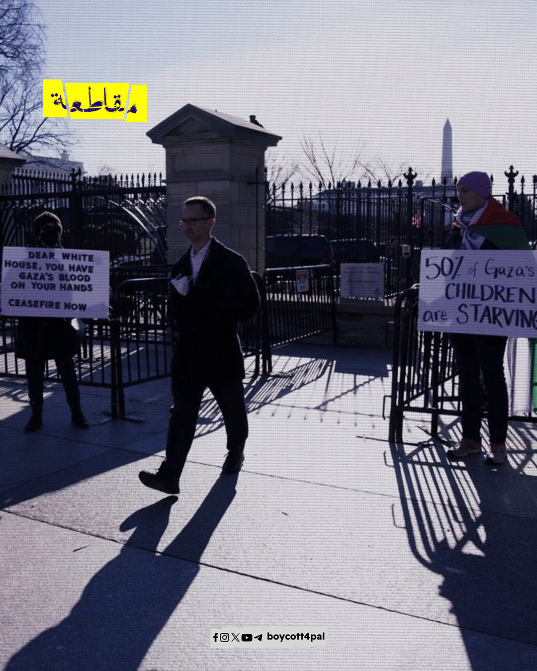 مجموعة من النشطاء نظموا احتجاجًا مؤيدًا للفلسطينيين خارج البيت الأبيض، للمطالبة بوقف إطلاق النار في غزة ورفعوا لافتات تقول إن أطفال القطاع يعانون الجوع، وتطالب بوقف فوري للإبادة التي لطخ جو بايدن أيديه بها.