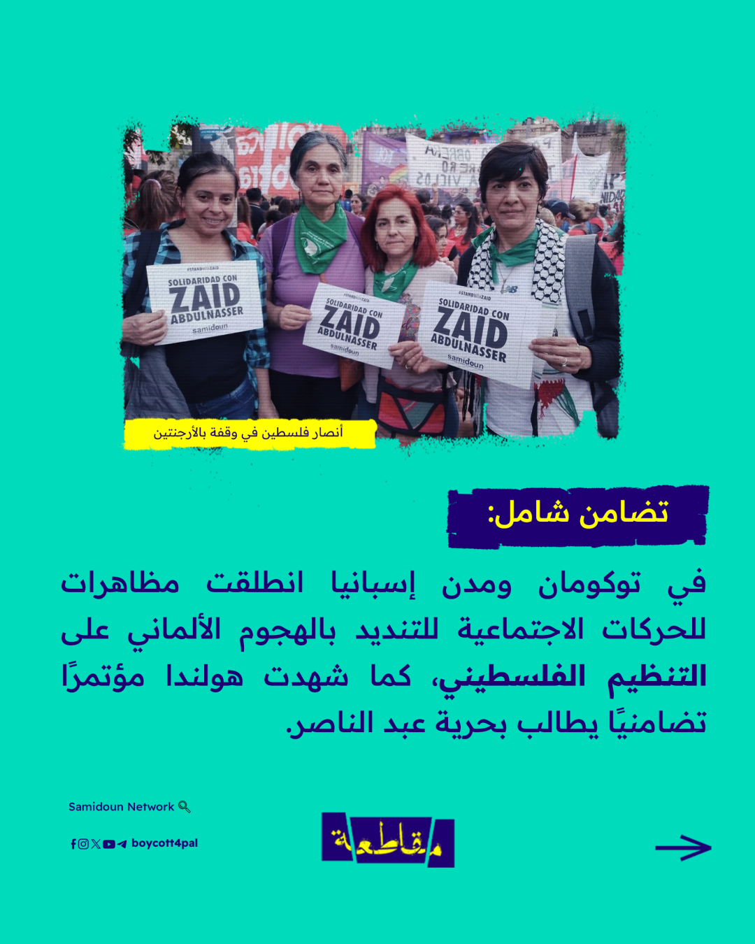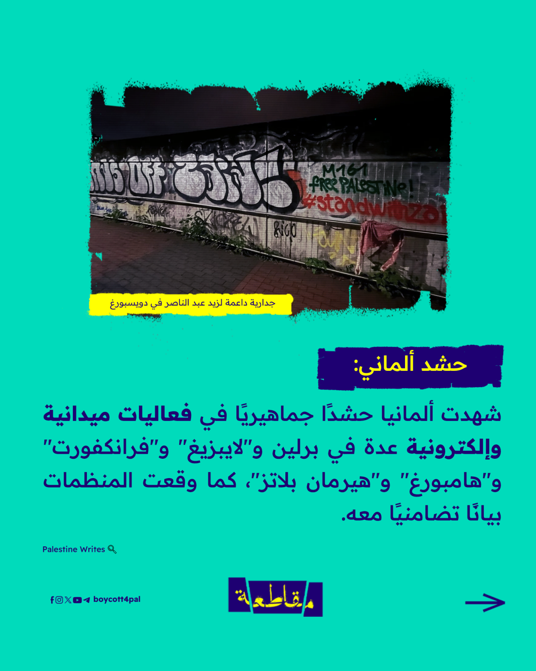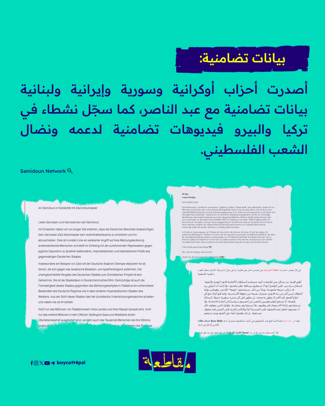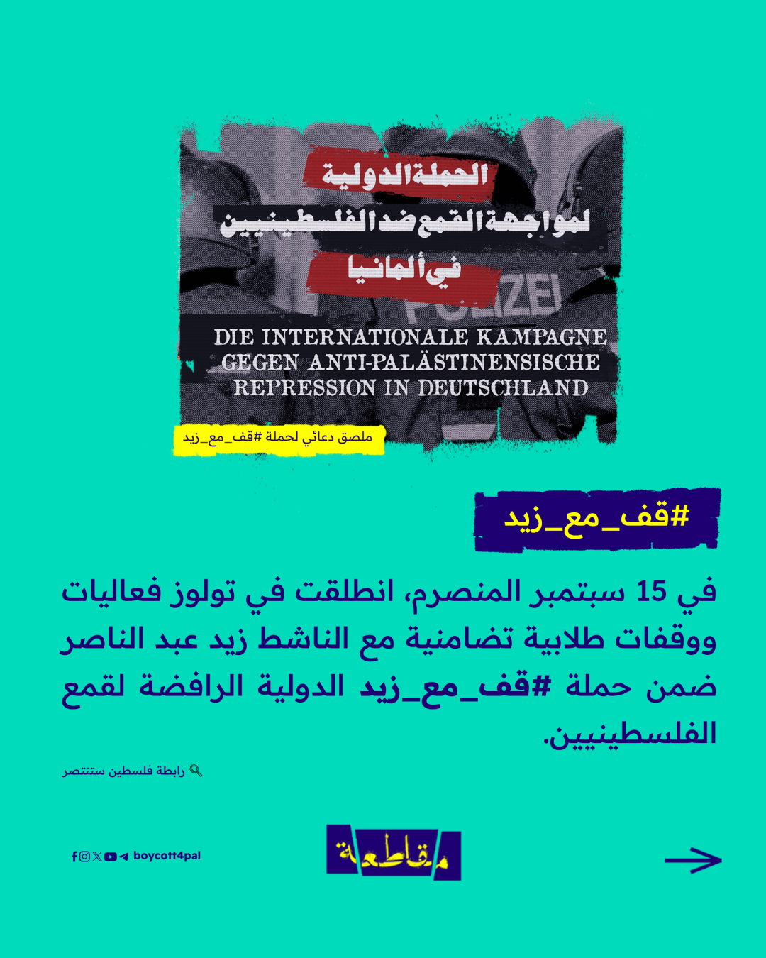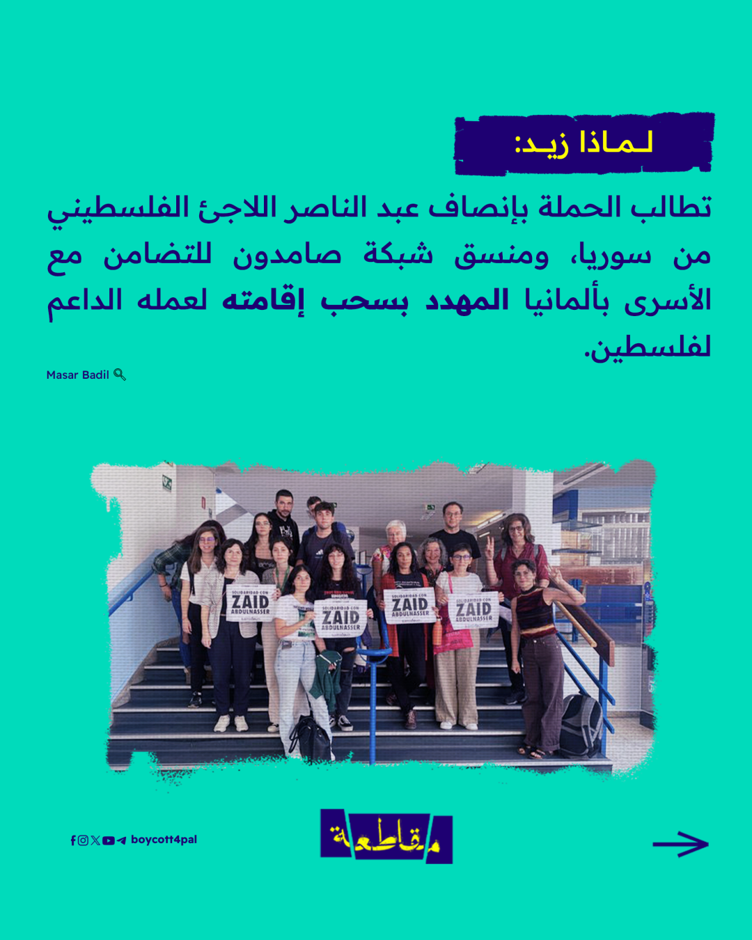 تحت عنوان #قف_مع_زيد، انطلقت حملة داعمة للناشط الفلسطيني زيد عبد الناصر المهدد بسحب إقامته من قبل السلطات الألمانية في أكثر من 10 دول بالعالم؛ تنديدًا بتصاعد قمع الفلسطينيين في أوروبا.