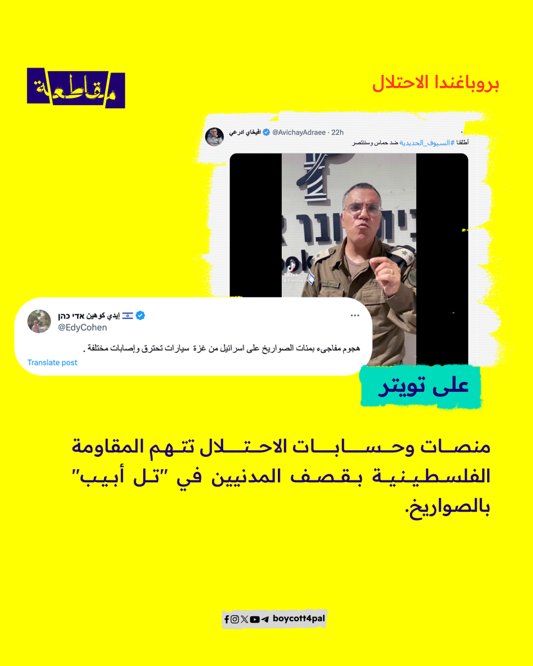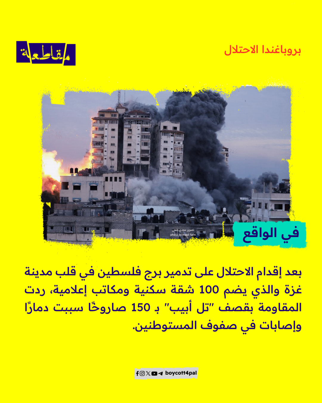 يركز الاحتلال على ضخ دعاية مركزة تتهم المـ،ـقاومـ،ـة الفلسطينية بقصف مدينة “تل أبيب”، واستهداف المستوطنين المدنيين في داخلها، قبل أن تخدعك “بروباغندا” الاحتلال، تذكر أن هذا القصف هو دفاع مشروع عن النفس، ورد مباشر من مقاتلي الحرية على تدمير الأبراج السكنية والبيوت فوق رؤوس سكانها في قطاع غزة.