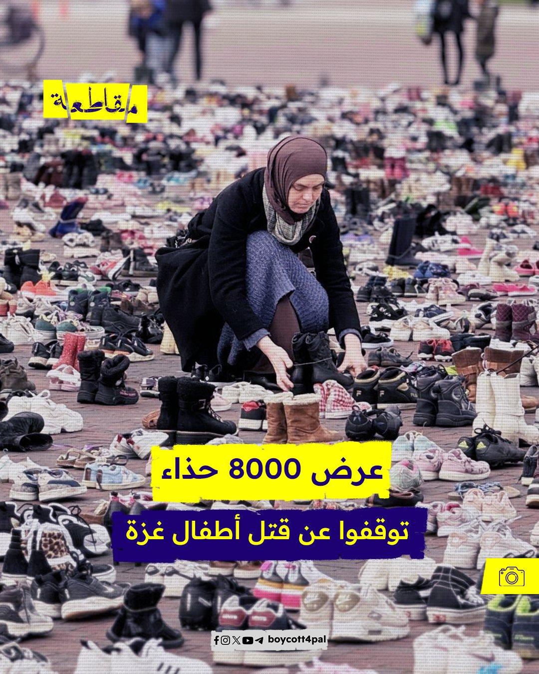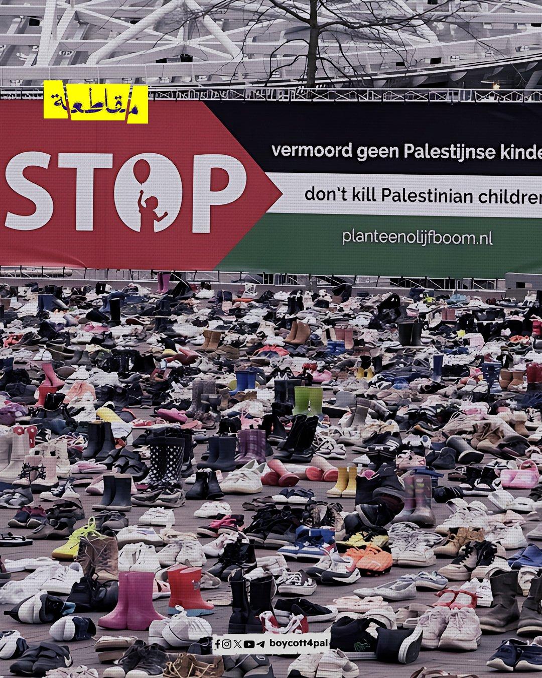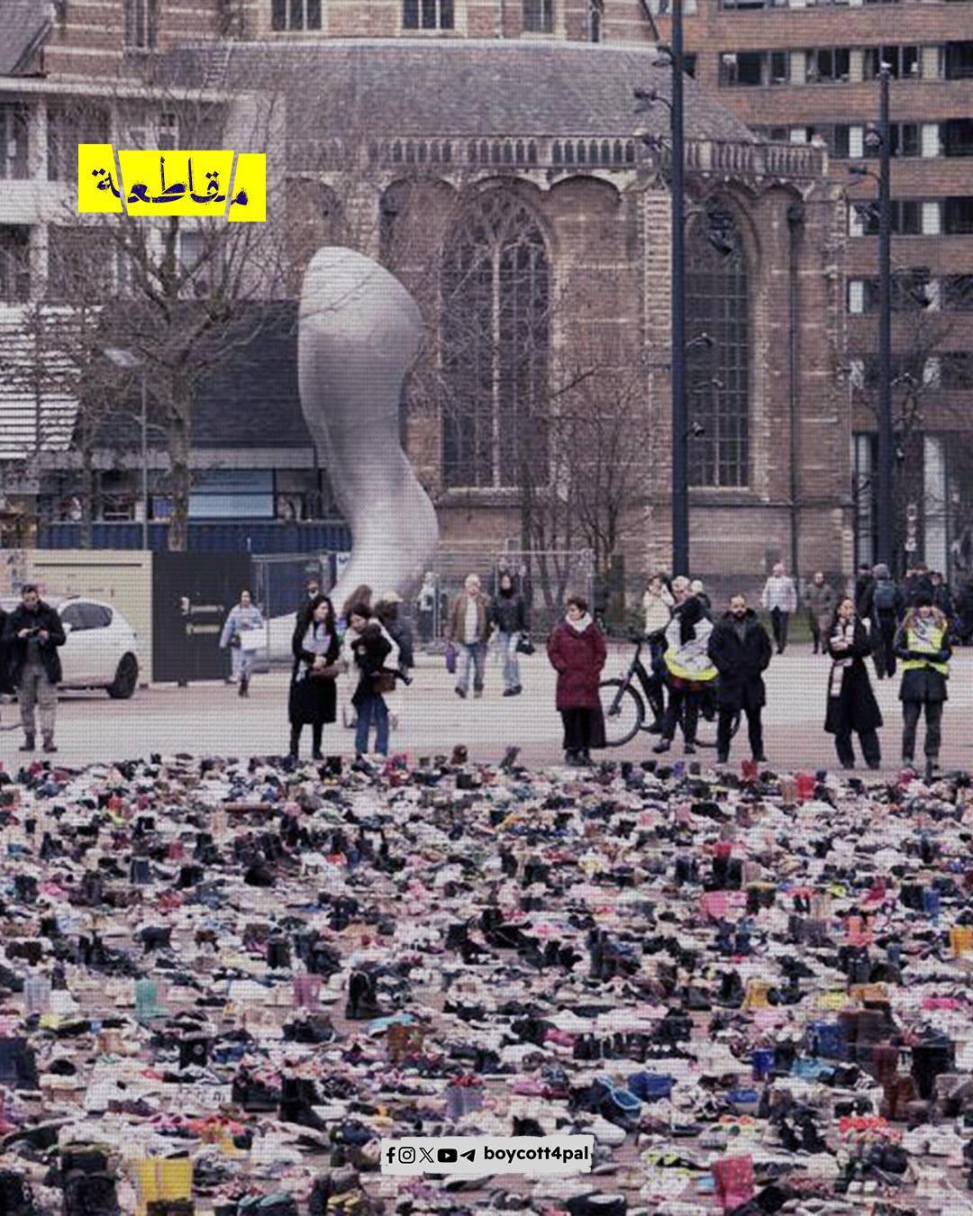 أحيا متضامنون مع غزة في في ساحة Binnenrotte بهولندا، ذكرى الأطفال الذين قتلوا في هجمات الاحتلال على القطاع بعرض رمزي لـ 8000 حذاء للفت الانتباه إلى ما يعانيه الأطفال في الصراع.