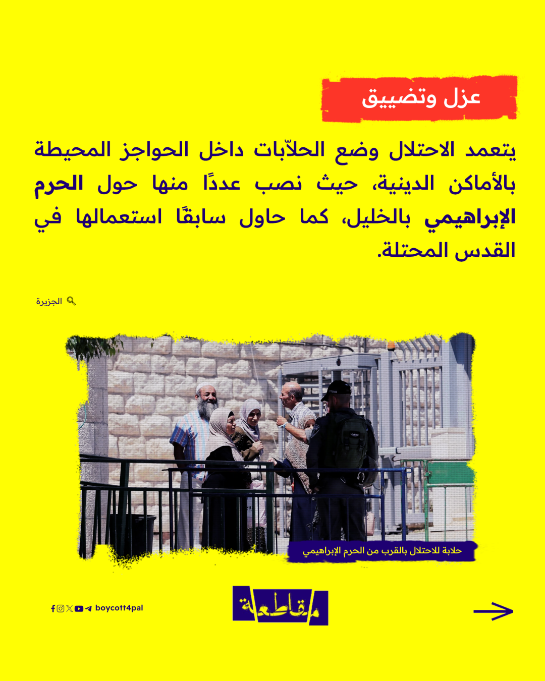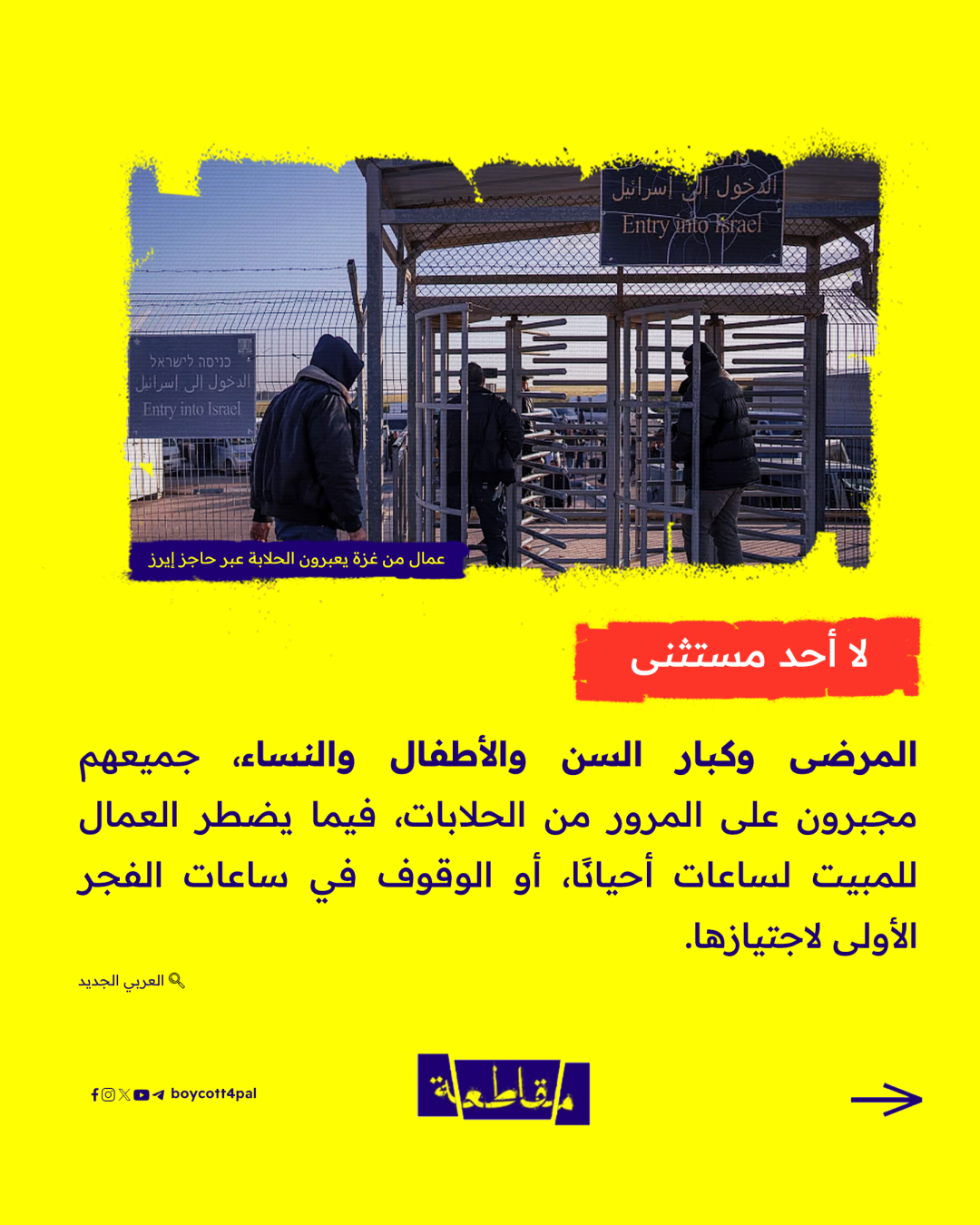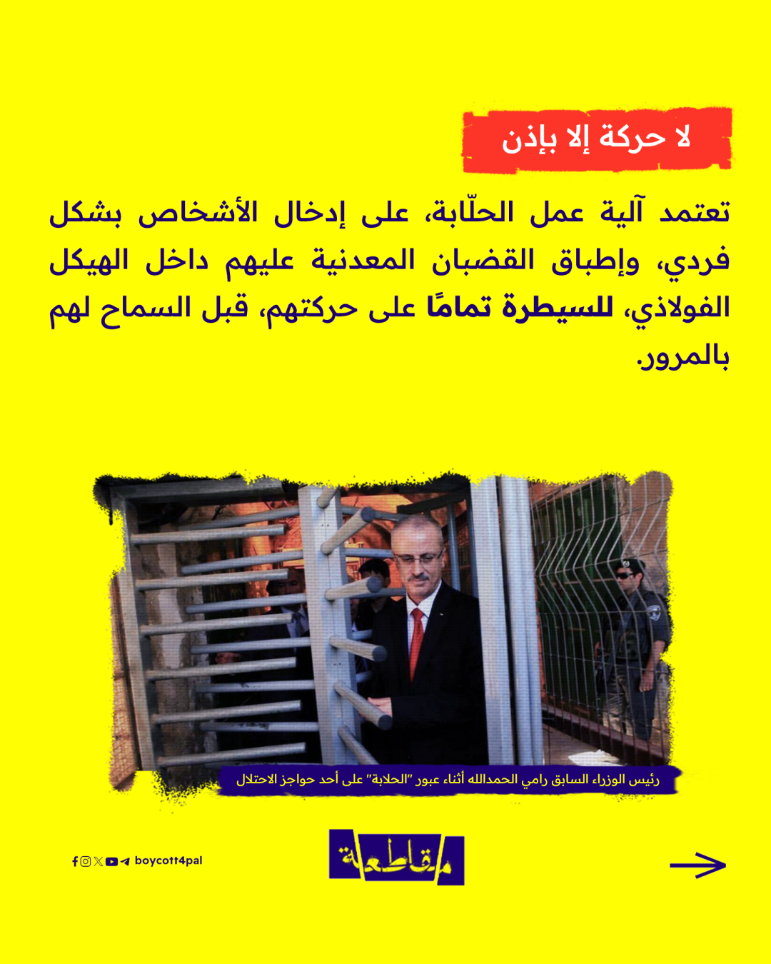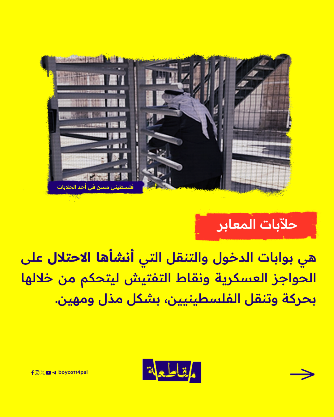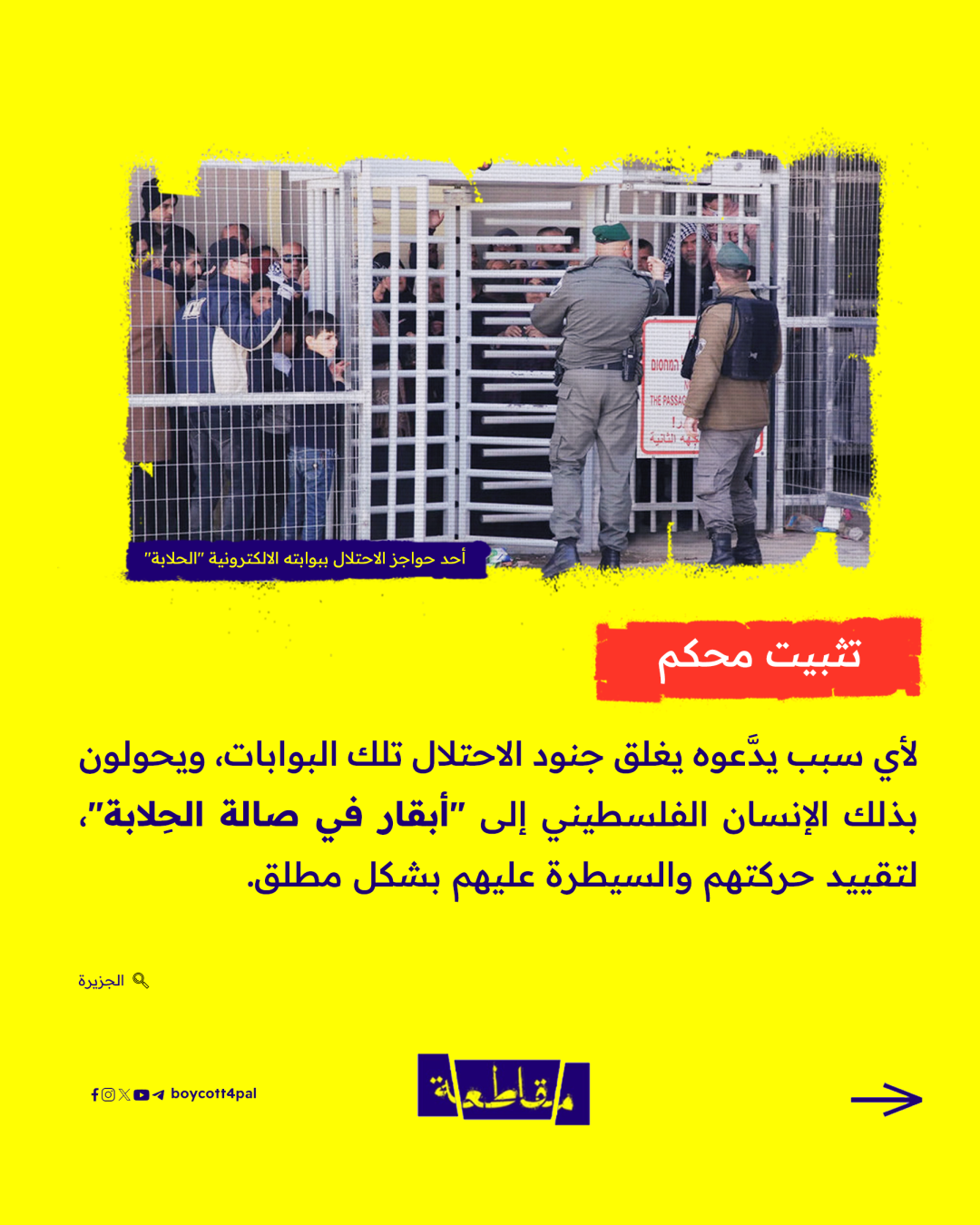آلة فصل عنصري يستخدمها كيان الاحتلال الإسرائيلي لإهانة الفلسطيني ومعاملته كالبهائم باستغلال حاجته للعلاج أو للعبور إلى المناطق التي يفصلها جدار الفصل.