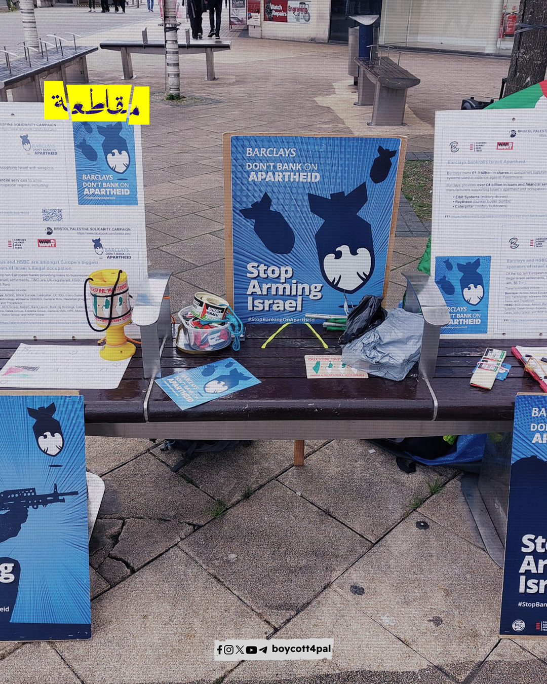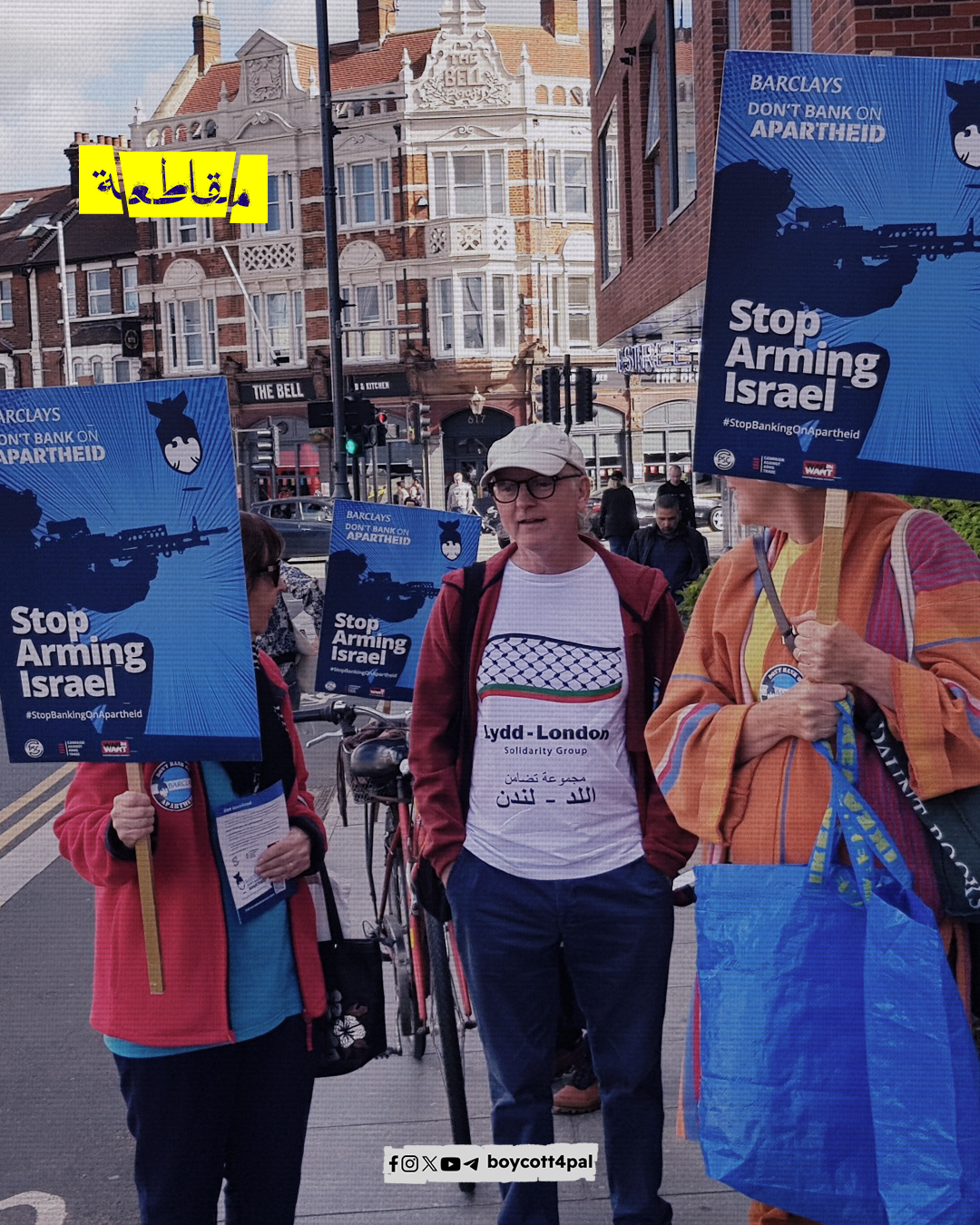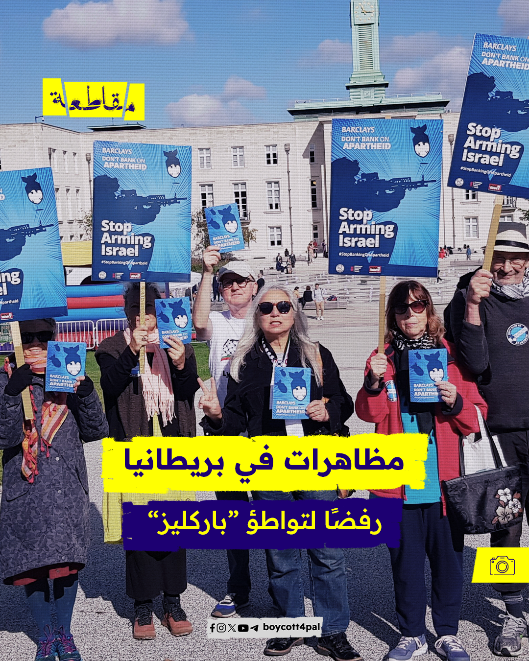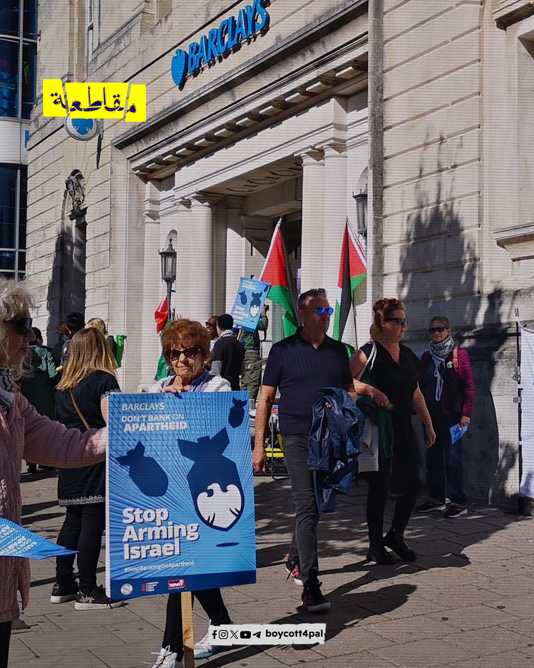 نظّم أنصار الحق الفلسطيني يوم أمس وقفات احتجاجية أمام أفرع بنك “باركليز” في بريطانيا، رفضًا لاستثمار البنك في الشركات الداعمة للاحتلال والتي تُزوّد جيشه بالأسلحة والعتاد، وكانت حملة التضامن مع فلسطين قد دعت لوقفات أمام أفرع البنك في بريطانيا حتى 25 سبتمبر الجاري.