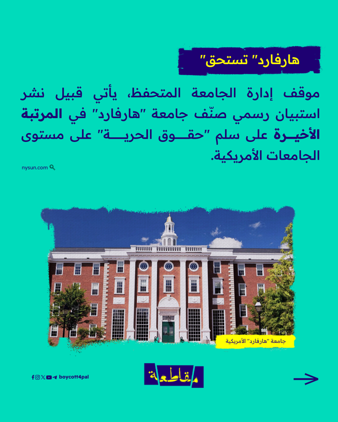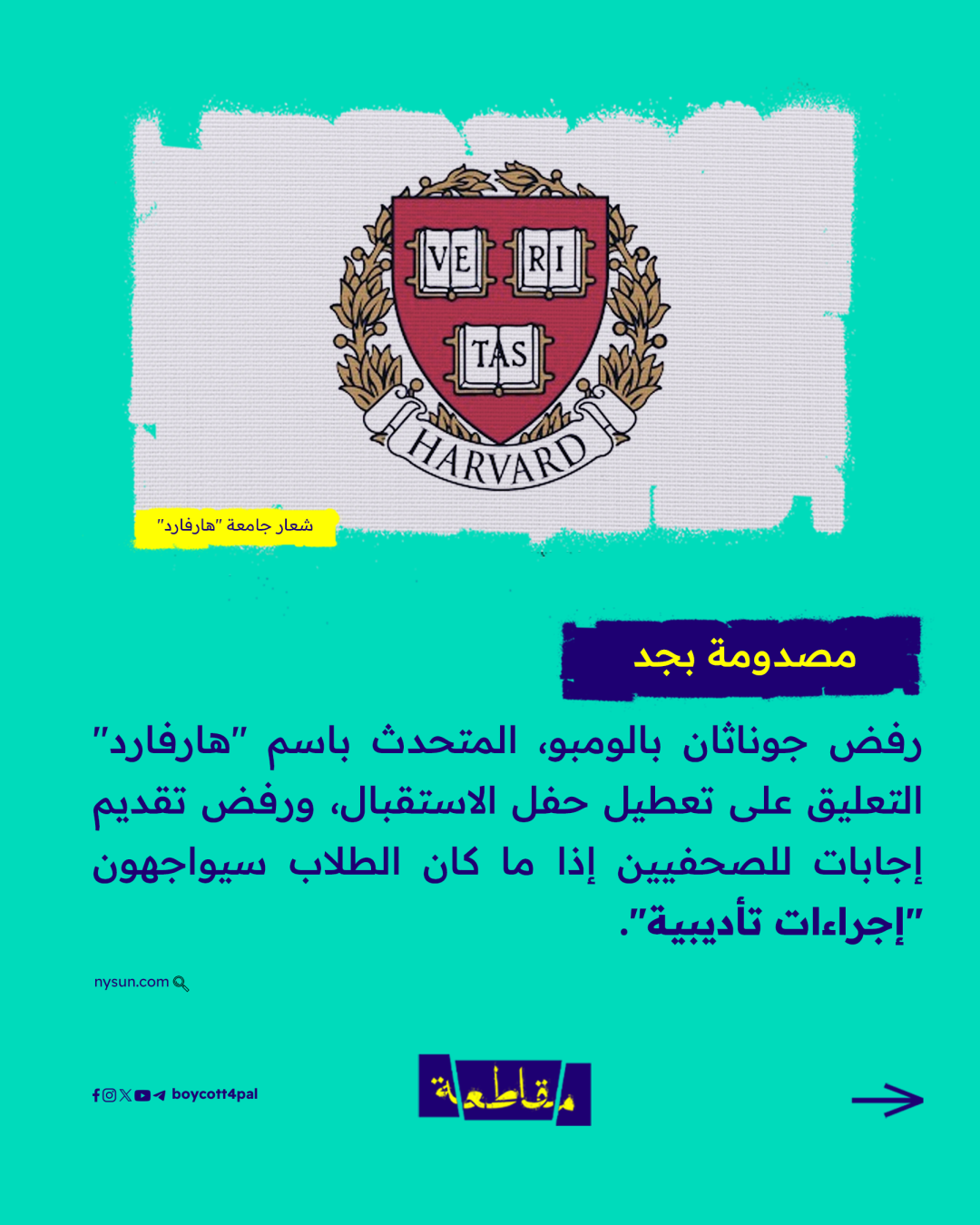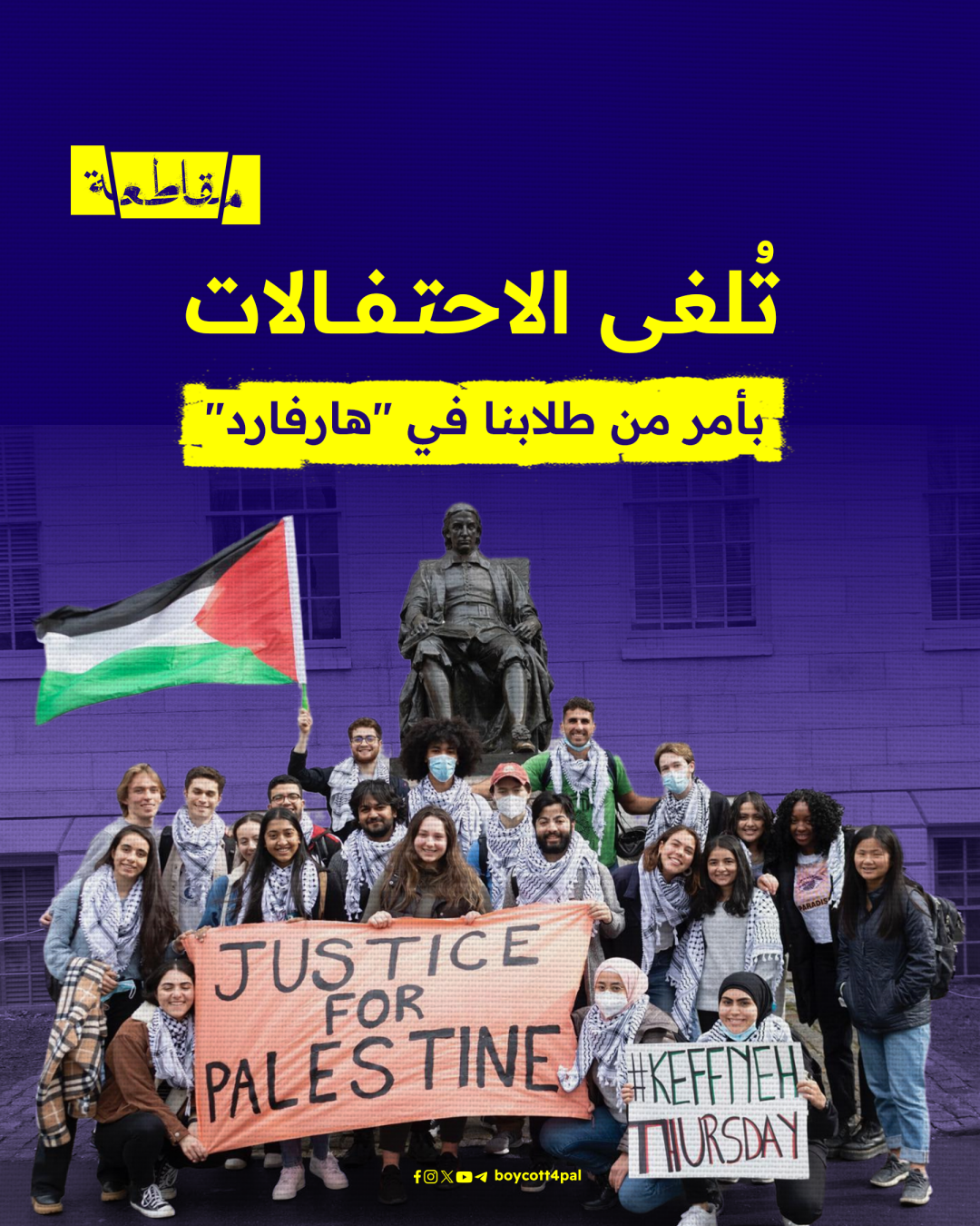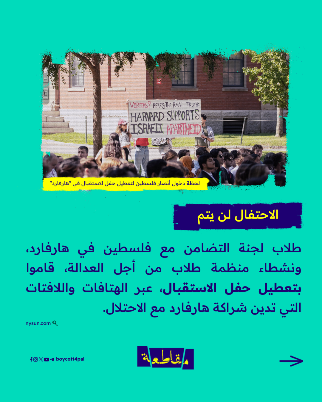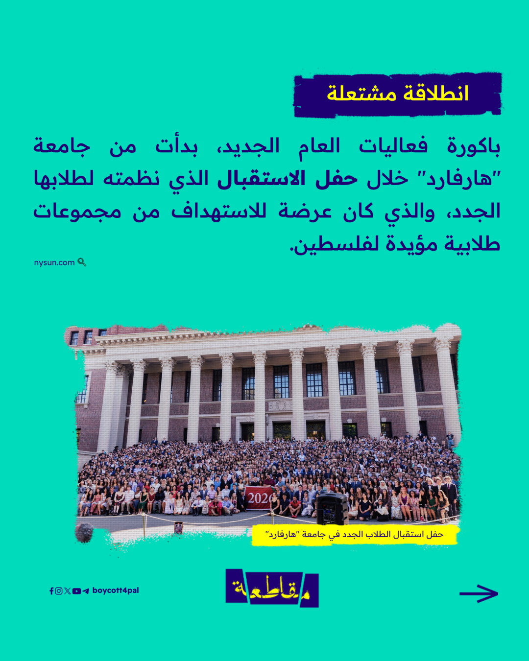 أنصار فلسطين من طلاب جامعة هارفارد يعرقلون حفل استقبال الطلبة الجدد وافتتاح العام الدراسي، ويواصلون الضغط على إدارة جامعتهم لإجبارها على قطع علاقاتها الأكاديمية مع الاحتلال..