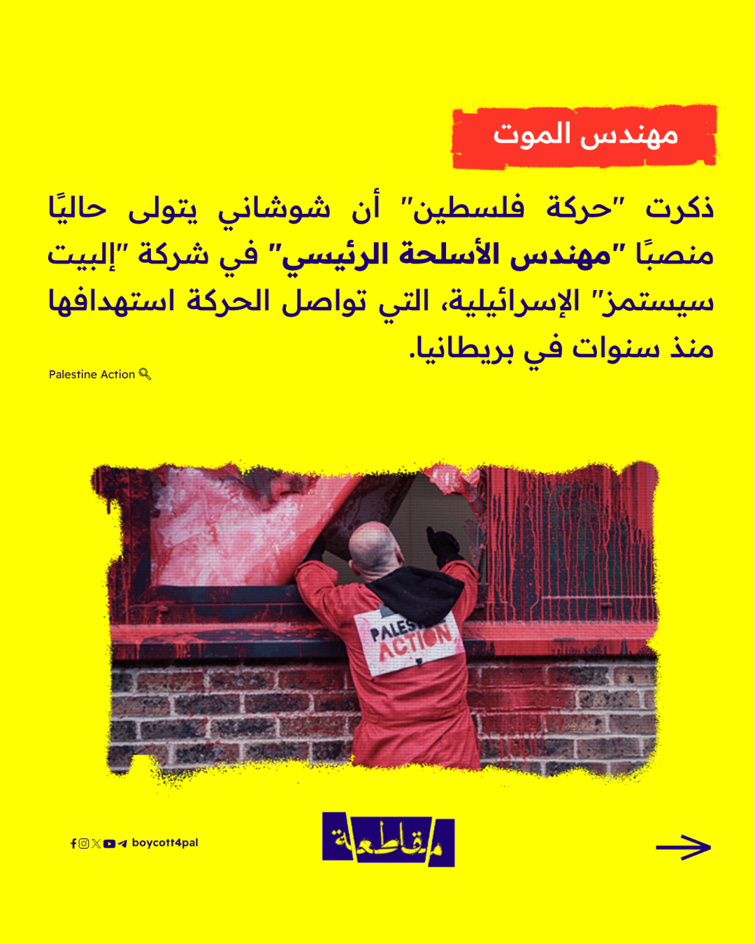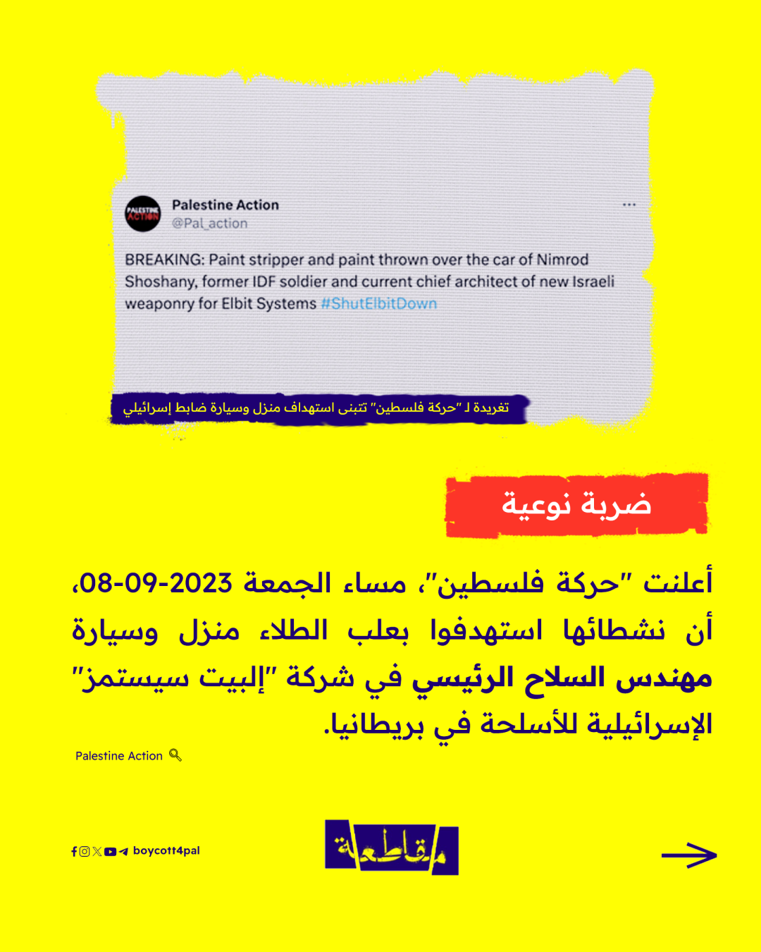 في خطوة غير مسبوقة ضمن حربها المفتوحة على شركة الأسلحة الإسرائيلية “إلبيت سيستمز”، أعلنت “حركة فلسطين” استهداف منزل وسيارة ضابط في جيش الاحتلال، يعمل اليوم كـ “مهندس أسلحة” في الشركة الإسرائيلية، ويقيم في بريطانيا.