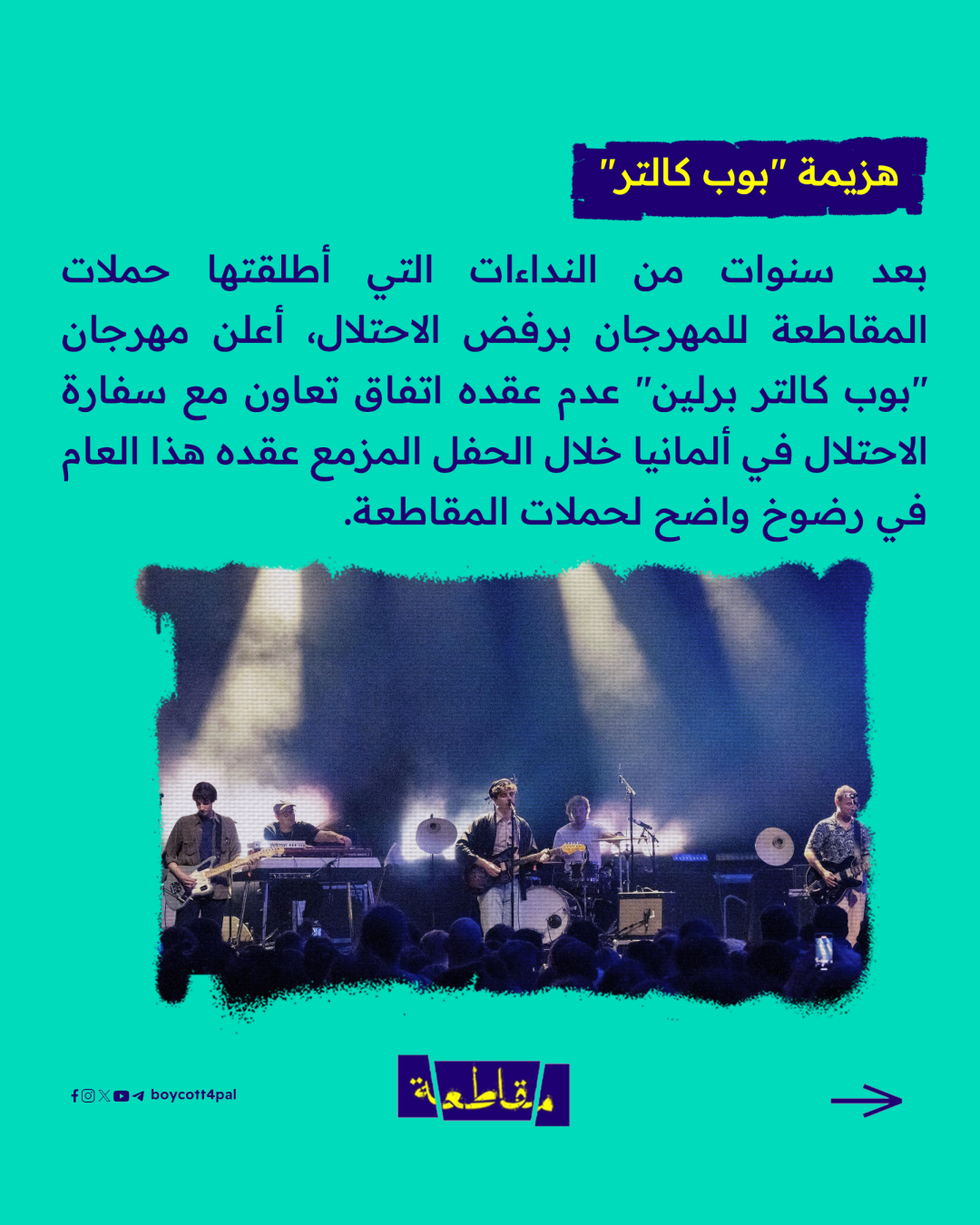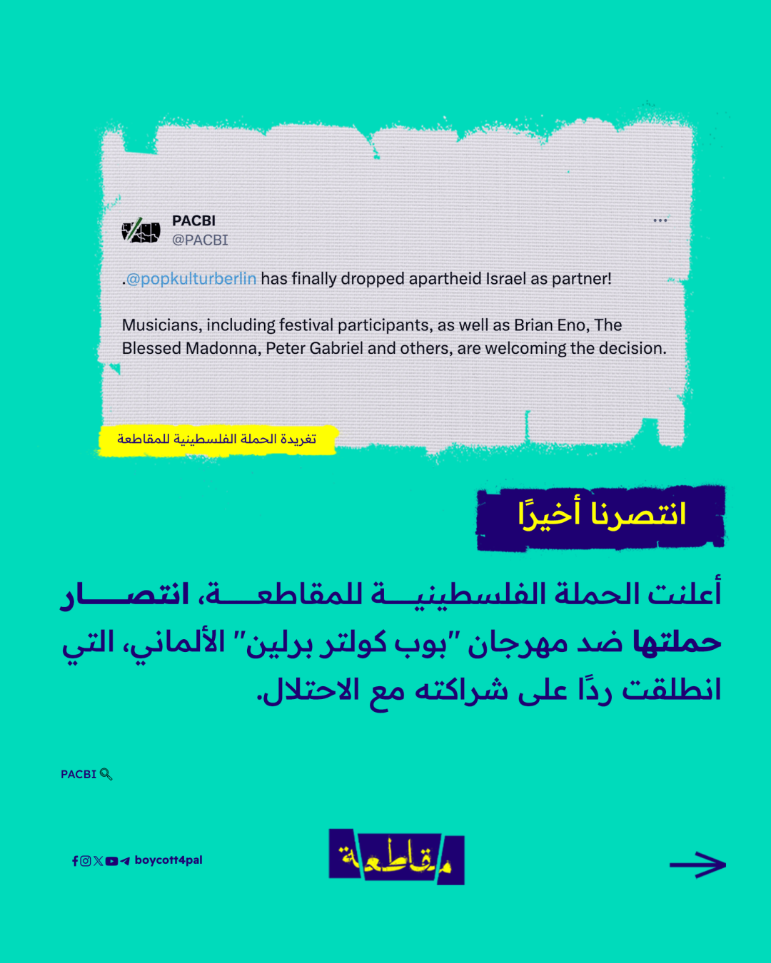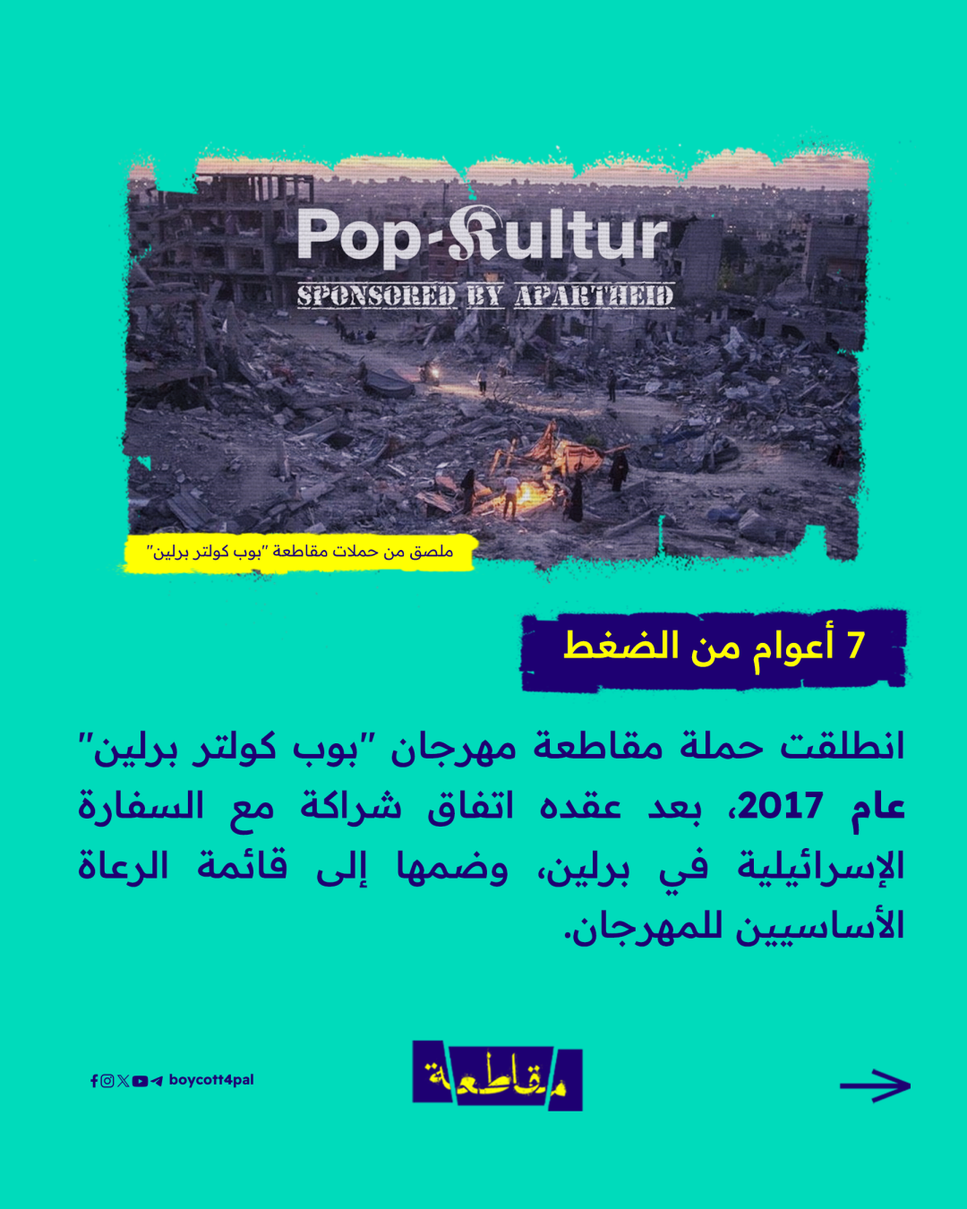 بعد 7 أعوام من المقاطعة المتواصلة،و الحشد العالمي ضده، ورغم تهديدات نائب عمدة برلين بـ “التصدي الحازم للمقاطعة”، رضخ مهرجان “بوب كولتر برلين” أخيرًا، وأعلن إلغاء عقد الرعاية مع سفارة الاحتلال في ألمانيا.