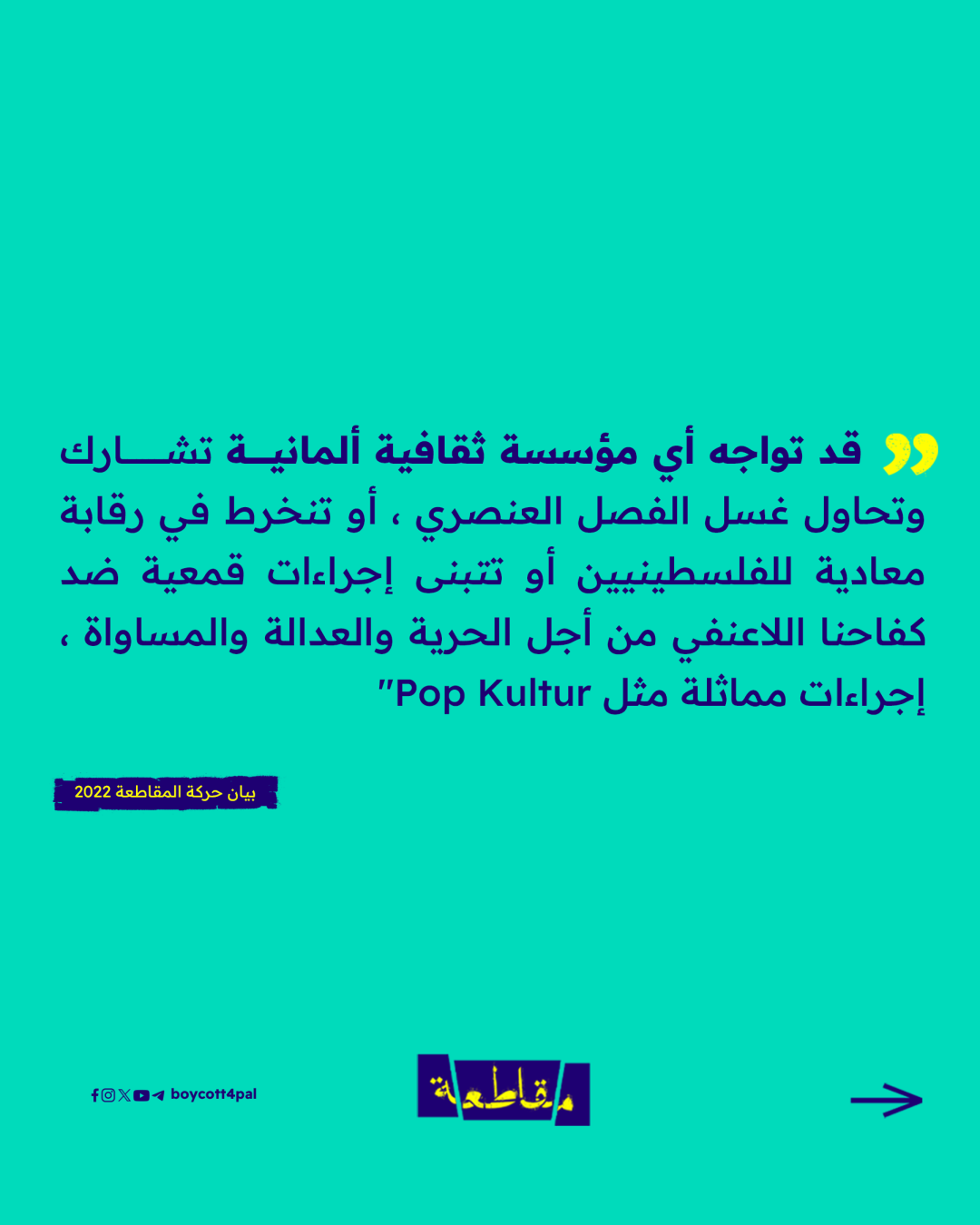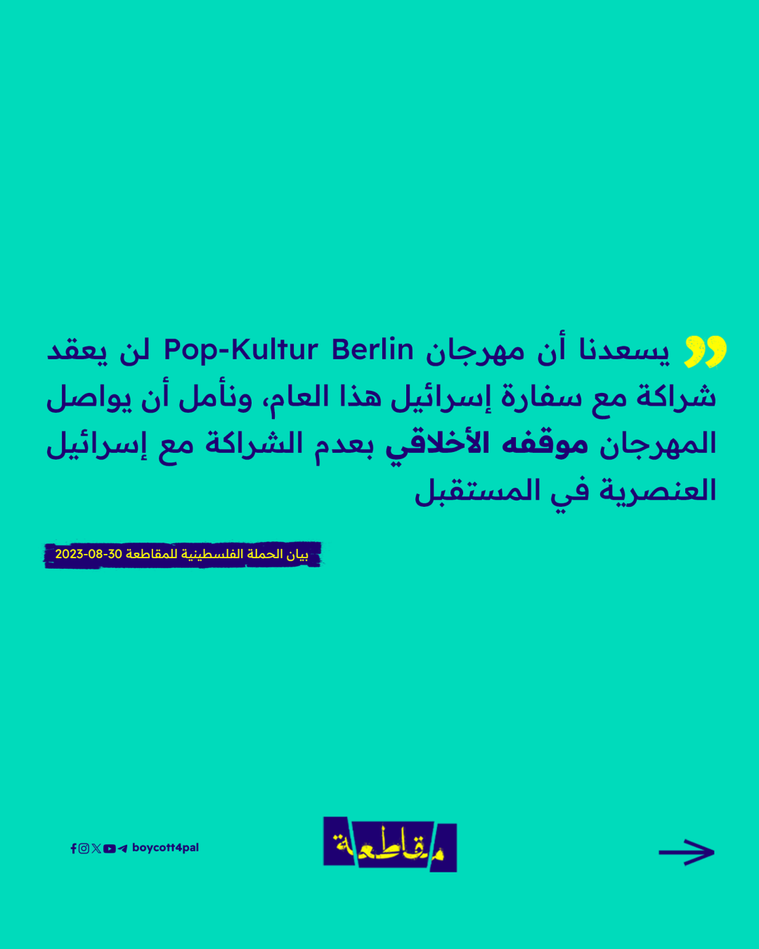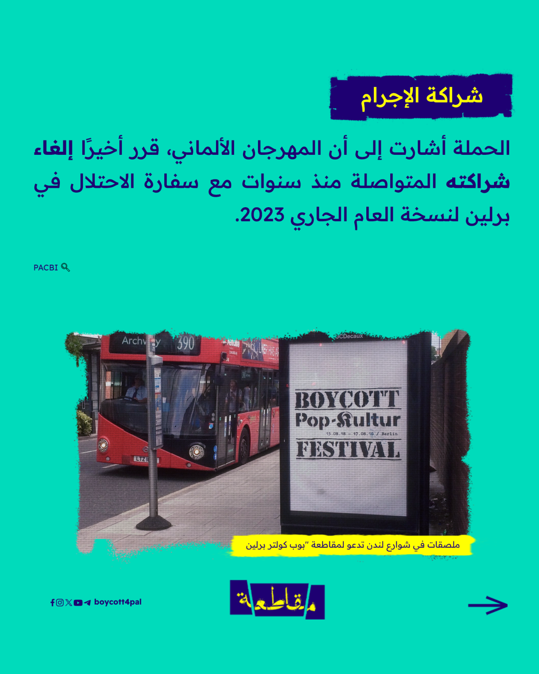 بعد 7 أعوام من المقاطعة المتواصلة،و الحشد العالمي ضده، ورغم تهديدات نائب عمدة برلين بـ “التصدي الحازم للمقاطعة”، رضخ مهرجان “بوب كولتر برلين” أخيرًا، وأعلن إلغاء عقد الرعاية مع سفارة الاحتلال في ألمانيا.