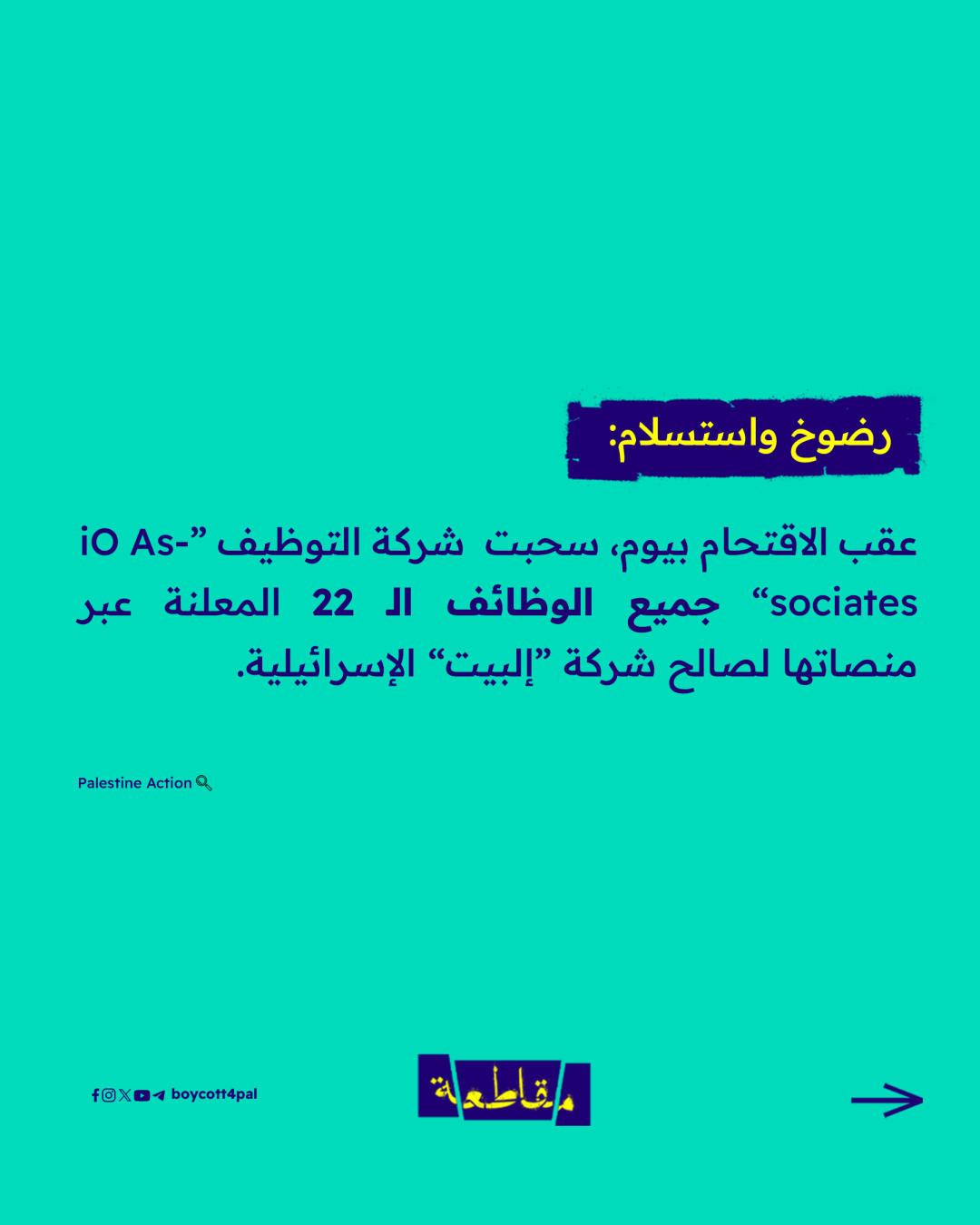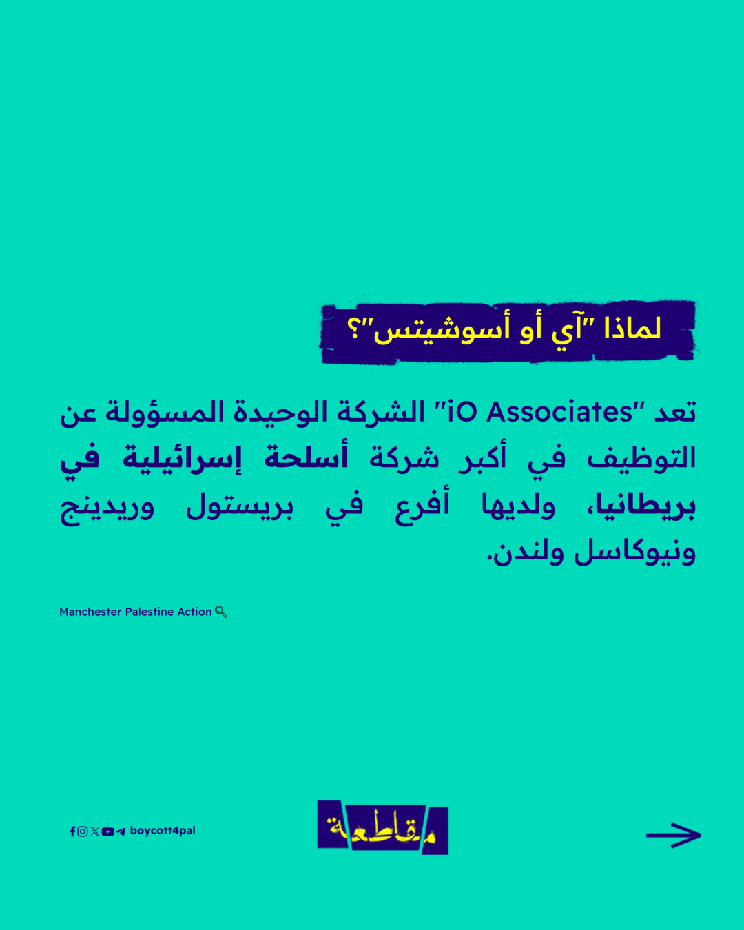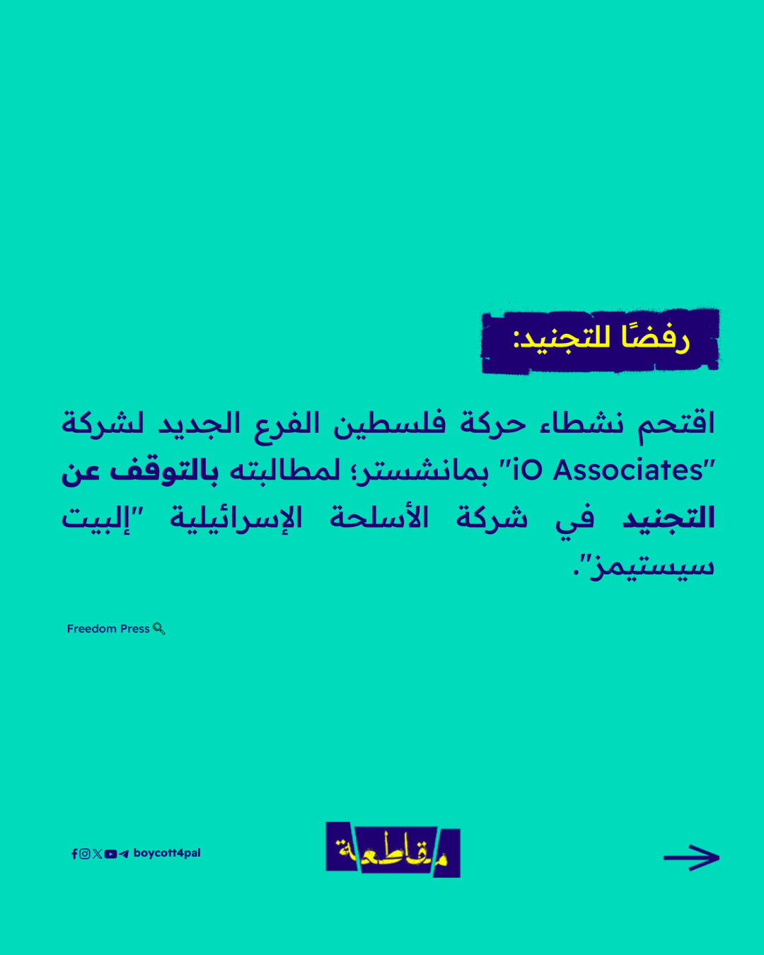 نجح الاحتجاج الذي بدأته حركة فلسطين ضد شركة "آي أو أسوشيتس" للتوظيف في مانشستر للمطالبة بوقف تواطؤها مع شركة أسلحة إسرائيلية.!