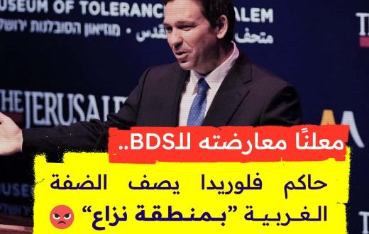 اعتبر حاكم ولاية فلوريدا “رون ديسانتيس”، أن الضفة الغربية هي مناطق “متنازع عليها” وليست محتلة، جاء ذلك خلال توقيعه على قانون لمكافحة “معاداة السامية” وإعلانًا يعترف بالعام الـ 75 “لاستقلال إسرائيل”، يذكر أن “ديسانتيس” هو مرشح محتمل للانتخابات الرئاسية عن الحزب الجمهوري.