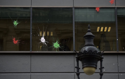 التقطت هذه الصورة في العاصمة الأرجنتينية بيونس آيريس عام 2014، بعد قيام مئات المتظاهرين برشق واجهات السفارة الإسرائيلية بطلاء يحمل ألوان العلم الفلسطيني، خلال مظاهرات ضخمة شهدتها المدينة ضد العدوان على قطاع غزة.
