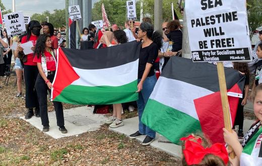 نظم تجمع طلاب من أجل العدالة في فلسطين بجامعة جنوب فلوريدا السبت الماضي، مظاهرة لإحياء الذكرى الـ75 للنكبة الفلسطينية وتنديدًا باستمرار الجرائم الإسرائيلية بحق الشعب الفلسطيني، حيث تظاهر نحو 50 شخصًا رافعين أعلام فلسطين ولافتات مطالبة بإنهاء نظام الفصل العنصري الإسرائيلي.