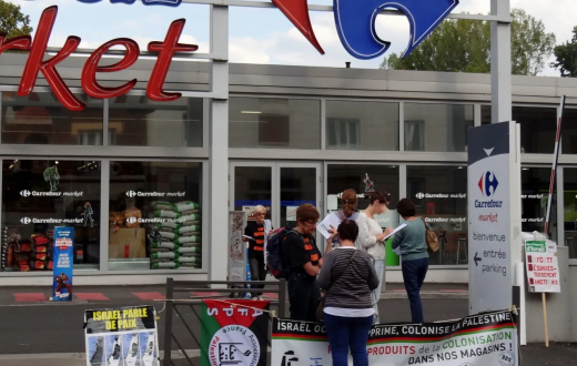 نظّم مجموعة من الطلبة وقفة أمام متجر شركة “كارفور” الفرنسية في مركز سيتي سنتر بالعاصمة بيروت، احتجاجًا على تواطؤ الشركة الفرنسية في جرائم الاحتلال بحق المدنيين في الأراضي الفلسطينية المحتلة، وتأتي هذه الوقفة ضمن فعاليات عالمية دعت لها حركات المقاطعة ضدّ الشركة.