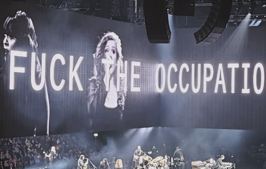 التقطت هذه الصورة خلال الحفل الأخير الذي أقامه الفنان روجر ووترز في العاصمة الألمانية برلين، وجاءت العبارة المدونة على شاشات العرض الضخمة في الحفل، ردًا من الفنان على مظاهرات أنصار الاحتلال أمام القاعة، واتهامهم ووترز بـ”معاداة السامية” بسبب مواقفه المؤيدة للقضية الفلسطينية.