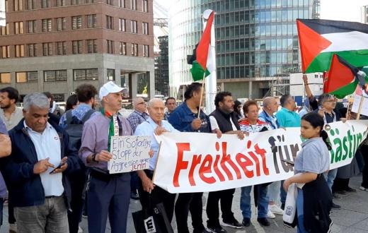 نظمت لجنة العمل الوطني المشترك بالتشارك مع هيئة المؤسسات العربية والفلسطينية في العاصمة الألمانية برلين، وقفة إسنادية؛ لدعم جنين عقب العدوان الإسرائيلي الأخير عليها، حيث رفعوا الأعلام واللافتات والفلسطينية مؤكدين دعمهم للمقاومة، كما طالبوا المجتمع الدولي بتوفير الحماية للفلسطينيين.