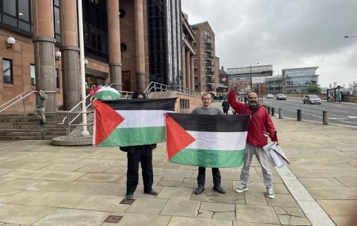 تواصل محكمة “نيوكاسل كراون” محاكمة نشطاء فلسطين على خلفية مشاركتهم في العمل ضدّ مصانع شركة "إلبيت سيستمز" للأسلحة الإسرائيلية، وحسب الحركة فإن نشطائها يدافعون عن أنفسهم بتهمة تدمير مصنع الشركة، مؤكدةً على أن مجرمي الحرب هم المذنبون وليس الفلسطينيين.