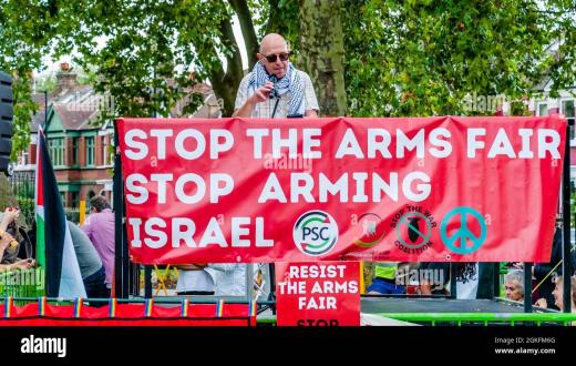 تتصاعد الفعاليات الاحتجاجية التي تقودها حملة التضامن مع فلسطين في بريطانيا تحت شعار "أوقفوا معرض الأسلحة" ضد معرض "DSEI"، رفضًا لتغذيته التكنولوجيا العسكرية ضد الفلسطينيين، وخلال إحدى الوقفات الاحتجاجية دعا عمدة لندن "صادق خان" للعمل على وقف الحدث مؤكدًا معارضته له.