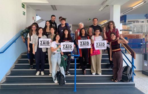 نظمت جامعة مدريد المستقلة وقفة تضامنية مع منسق شبكة صامدون للتضامن مع الأسرى زيد عبد الناصر المهدد من قبل السلطات الألمانية بالترحيل، بمشاركة أساتذة وطلاب قسم الدراسات العربية في الجامعة، منددين بالقمع المنهجي لأنصار الحق الفلسطيني في ألمانيا.