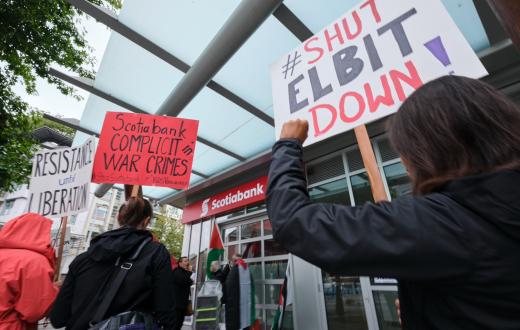 نظمت الجمعية الكندية الفلسطينية وقفة احتجاجيّة ضد بنك "سكوتيا" في مدينة فانكوفر، للمطالبة بسحب استثماراته من شركة الأسلحة الإسرائيلية "إلبيت سيستيمز" الضالعة في الجرائم ضد الفلسطينيين، موضحةً أن بنك "سكوتيا" هو أكبر مستثمر أجنبي في شركة الأسلحة الإسرائيلية.