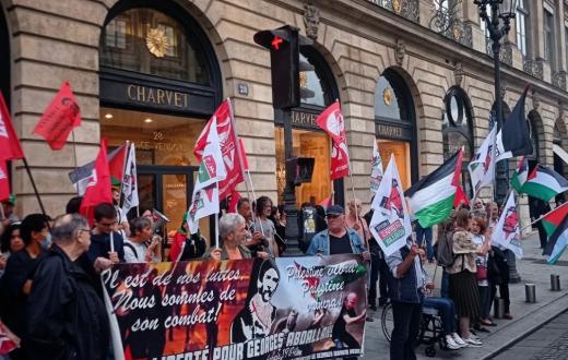 نظمت شبكة صامدون للتضامن مع الأسرى في باريس أمس مظاهرة تضامنية أمام وزارة العدل للمطالبة بالإفراج عن الأسير جورج عبدالله المعتقل في فرنسا منذ 39 عامًا لدعمه فلسطين، داعيةً للمشاركة في المظاهرة السنوية في 21 أكتوبر المقبل أمام سجن "لانيمزان" الفرنسي الذي يحتجز فيه عبدالله.