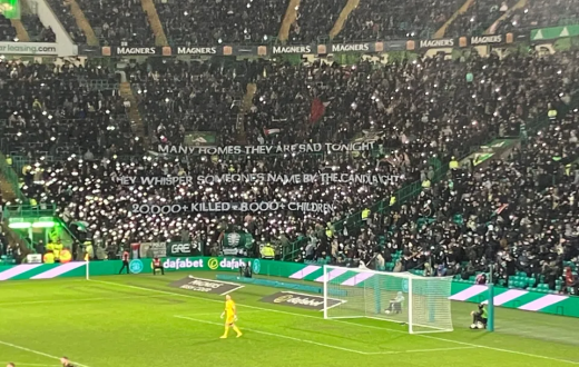 رفعت جماهير فريق سيلتك الأسكتلندية لافتة موجهة للعالم كتب عليها “العديد من المنازل حزينة خذا المساء يهمسون اسم شخص ما على ضوء الشموع، 20 ألف شخص قتلوا بينهم 8 آلاف طفل.