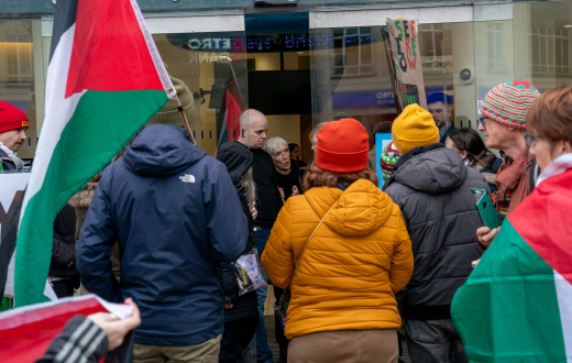 نظّم تحالف "بريستول الفلسطيني" الفعالية، ليشق أنصار فلسطين طريقهم من متجر إلى آخر في منطقة برودميد التجارية، تشجيعًا على مقاطعة الشركات الداعمة ماليًا للاحتلال. وتجمع عشرات الأشخاص خارج بنك باركليز، وأغلق الموظفون الأمن الباب الأمامي للبنك بينما حاول المتظاهرون الدخول.