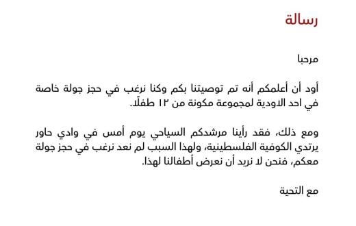 تلقت شركة ROVE Adventures رسالة من مجموعة ألغت رحلة لـ12 طفلًا إلى منطقة وادي بعد رؤية صورة لمرشد الشركة السياحي يرتدي الكوفية. وبررت المجموعة الإلغاء بـ"عدم تعريض الأطفال لهذا الأمر". لكن الشركة ردت في المقابل قائلةً: "شرف عظيم لنا أن نمثّل القضية الفلسطينية في مغامراتنا".