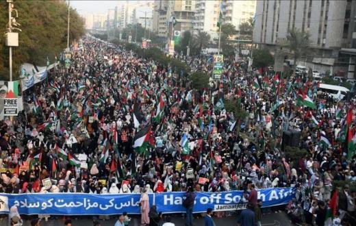 المسيرة في مدينة كراتشي الباكستانية، حظيت بمشاركة شخصيات بارزة من المجتمع المسيحي والهندوسي ونظمها حزب الجماعة الإسلامية، حمل المشاركون في المسيرة الأعلام والكوفية وأطلقوا هتافات منددة بالولايات المتحدة و”إسرائيل” تزامنا مع تخطي الحرب الإسرائيلية على قطاع غزة يومها الـ100.