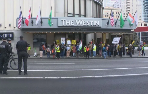 احتشدت مجموعة من المتظاهرين المؤيدين للفلسطينيين وسط مدينة سياتل خارج فندق ويستن، حيث كانت رئيسة مجلس النواب السابقة تلقي كلمة، وقاطع المتظاهرون كلمتها بالهتاف لفلسطين والمطالبة بوقف إطلاق النار و"رفع الحصار عن غزة الآن" و”إنهاء التمويل الأمريكي”.
