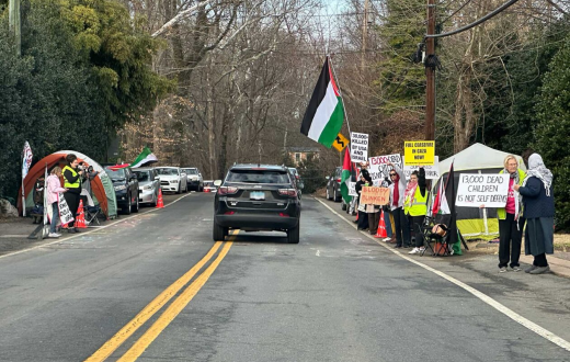 المتضامنون نصبوا الخيام أمام بيت وزير الخارجية الأمريكي، أنتوني بلينكن في ولاية فيرجينيا، اعتراضاً على موقف الولايات المتحدة من الحرب الإسرائيلية على غزة، مؤكدين أنهم سيبقون في الخيام طوال الإجازة الأسبوعية.