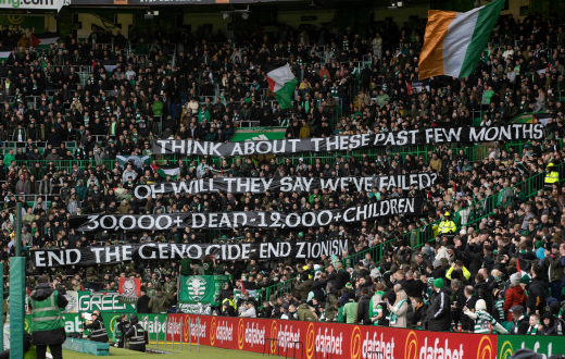 في مباراة فريقها الأخيرة، جددت جماهير نادي “سيلتك” الاسكتلندي مشاهد التضامن مع فلسطين في وجه الإبادة الجماعية، حيث رُفعت لافتات ضخمة في المدرجات، تطالب بوقف الإبادة الجماعية وإنهاء الصهيونية، وأرقام بأعداد ضحايا الإبادة المتواصلة في غزة.