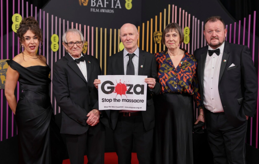 المخرج كين لوتش، مع كاتب السيناريو بول لافيرتي حضروا حفل توزيع جوائز الأكاديمية البريطانية لفنون السينما والتلفزيون (بافتا) السنوي مع طاقم فيلم "ذا أولد أوك" الذي كان مرشحًا لجوائز خلال الحفل، حاملين اللافتة على السجادة الحمراء تطالب بـ"وقف المجزرة في غزة".