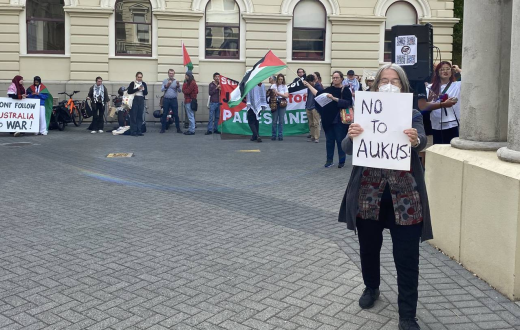 احتج طلاب ومؤيدون لفلسطين ضد إلقاء مساعدة وزير الخارجية الأمريكي لشؤون الحد من الأسلحة والأمن الدولي بوني جينكينز محاضرة في جامعة فيكتوريا في ويلينغتون، رفضًا لاتفاقية AUKUS الأمنية الثلاثية بين أستراليا والمملكة المتحدة والولايات المتحدة.