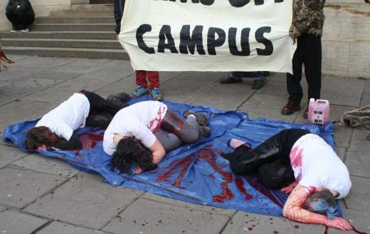 احتجاج الطلاب يأتي لتسليط الضوء على الروابط المستمرة للجامعة بتجارة الأسلحة وما يترتب على ذلك من تواطؤ في الإبادة الجماعية للفلسطينيين، وحمل النشطاء لافتة كتب عليها "Arms Off Campus" ودعوا الجامعة لقطع علاقاتها مع شركات الأسلحة.