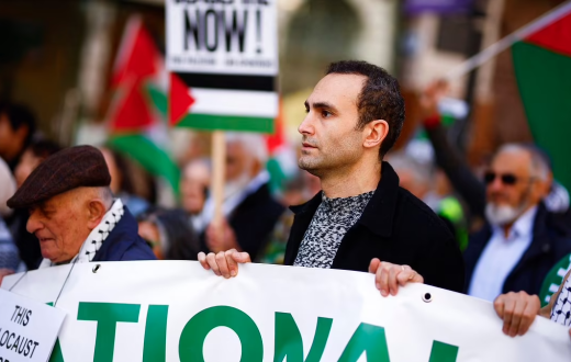 سار خالد عبد الله الذي يلعب دور صديق الأميرة ديانا الراحل دودي الفايد في عرض Netflix الناجح، مع موكب متظاهرين مؤيدين لفلسطين في لندن حيث خرج المحتجون بشكل جماعي للمطالبة بوقف الحرب الإسرائيلية على غزة وحملوا لافتات تشمل "الحرية لفلسطين"، و"أوقفوا المذبحة"، و"من النهر إلى البحر".