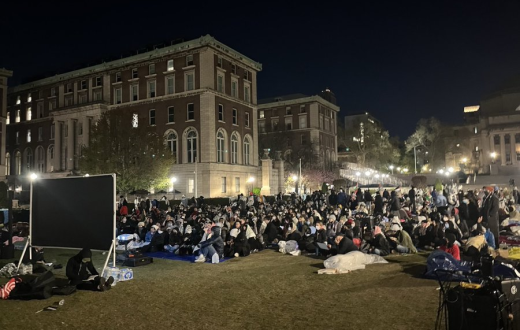 المئات من طلاب جامعة كولومبيا يحتشدون في ساحة الاعتصام المركزية داخل الجامعة، ويشاهدون فليمًا وثائقيًا بعنونا “ثورة كولومبيا 1968” حول المظاهرات الطلابية الحاشدة التي شهدتها الجامعة رفضًا لحرب فيتنام.